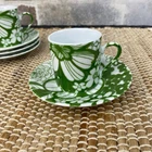 Four Demitasse Cups and four Saucers Classic Coffee & Tea Use for serving strong coffee like Espresso or Turkish Coffee In Green and White Floral Cups measure approx 2 1/8" tall and 1 7/8" diameter Cups are approx 2 ounces Saucer is approx 4.5" in diameter Never used