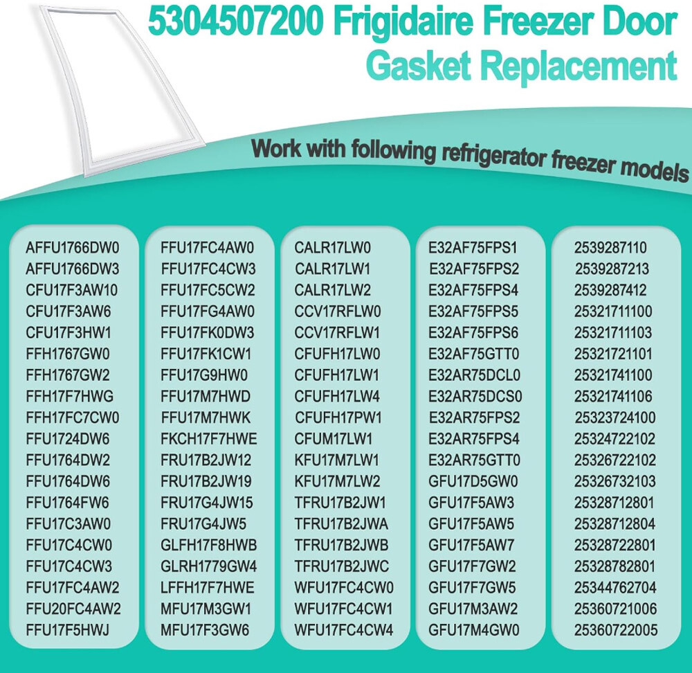 Upgraded 5304507200 Freezer Door Gasket,Great Sealing, Keep in Low-temperature 5304507200 Refrigerator Freezer Door Gasket compatible with Following Models Frigidaire Freezer Models AFFU1766DW0 AFFU1766DW1 AFFU1766DW2 AFFU1766DW3 AFFU1766DW4 AFFU1766DW5 CFU17F3AW0 CFU17F3AW10 CFU17F3AW2 CFU17F3AW3 CFU17F3AW5 CFU17F3AW6 CFU17F3AW8 CFU17F3AW9 CFU17F3HW0 CFU17F3HW1 CFU17F3HW3 CFU17M3HW0 FFH1767GW0 FFH1767GW1 FFH1767GW2 FFH1767GWZ FFH17F7HWA FFH17F7HWC FFH17F7HWD FFH17F7HWF FFH17F7HWG FFH17F7HWH FFH17F7HWJ FFH17FC7CW0 FFU1724DW0 FFU1724DW1 FFU1724DW10 FFU1724DW2 FFU1724DW3 FFU1724DW4 FFU1724DW5 FFU1724DW6 FFU1724DW7 FFU1724DW8 FFU1724DW9 FFU1764DW0 FFU1764DW1 FFU1764DW2 Frigidaire Freezer Models FFU1764DW3 FFU1764DW4 FFU1764DW5 FFU1764DW6 FFU1764FW0 FFU1764FW1 FFU1764FW2 FFU1764FW3 FFU1764FW4 FFU1764FW5 FFU1764FW6 FFU1767FW0 FFU17C2AW0 FFU17C3AW0 FFU17C3AW1 FFU17C4AW0 FFU17C4CW0 FFU17C4CW1 FFU17C4CW2 FFU17C4CW3 FFU17C4CW4 FFU17D7HW0 FFU17D7HW3 FFU17D9GW0 FFU17F5HWB FFU17F5HWC FFU17F5HWD FFU17F5HWE FFU17F5HWF FFU17F5HWG FFU17F5HWH FFU17F5HWJ FFU17F5HWK FFU17F5HWL FFU17F5HWM FFU17F5HWN FFU17F5HWP FFU17F5HWR FFU17F5HWS FFU17F5HWT FFU17F5HWU FFU17F5HWV FFU17F9GW0 FFU17F9GW1 FFU17F9GW2 Frigidaire Freezer Models FFU17F9GW3 FFU17F9GW4 FFU17F9GW5 FFU17F9HW0 FFU17F9HW1 FFU17F9HW2 FFU17F9HW3 FFU17FC3AW0 FFU17FC4AW0 FFU17FC4AW1 FFU17FC4AW2 FFU17FC4AW3 FFU17FC4CW0 FFU17FC4CW1 FFU17FC4CW2 FFU17FC4CW3 FFU17FC5CW0 FFU17FC5CW1 FFU17FC5CW2 FFU17FC5CW3 FFU17FC5CW4 FFU17FC5CW5 FFU17FC5CW6 FFU17FC5CW7 FFU17FC5CW8 FFU17FC8CW0 FFU17FG4AW0 FFU17FG4AW1 FFU17FG4AW2 FFU17FK0DW0 FFU17FK0DW1 FFU17FK0DW3 FFU17FK0DW4 FFU17FK0DW5 FFU17FK0DW6 FFU17FK1CW0 FFU17FK1CW1 FFU17G3AW0 FFU17G3AW1 FFU17G9HW0 FFU17G9HW1 FFU17G9HW2 Frigidaire Freezer Models FFU17K1CW0 FFU17K1CW1 FFU17K1CW2 FFU17M7HWA FFU17M7HWB FFU17M7HWC FFU17M7HWD FFU17M7HWE FFU17M7HWF FFU17M7HWG FFU17M7HWH FFU17M7HWJ FFU17M7HWK FFU17M7HWL FFU17M7HWM FFU17M8GW0 FFUH17F2NWA FFUH17F2NWB FKCH17F7HWA FKCH17F7HWB FKCH17F7HWC FKCH17F7HWD FKCH17F7HWE FKCH17F7HWF FRU1767GW0 FRU1767GW1 FRU1767GW2 FRU17B2JW0 FRU17B2JW1 FRU17B2JW10 FRU17B2JW11 FRU17B2JW12 FRU17B2JW13 FRU17B2JW15 FRU17B2JW16 FRU17B2JW17 FRU17B2JW18 FRU17B2JW19 FRU17B2JW20 FRU17B2JW21 FRU17B2JW23 FRU17B2JW24 FRU17B2JW25 Frigidaire Freezer Models FRU17B2JW26 FRU17B2JW3 FRU17B2JW4 FRU17B2JW5 FRU17B2JW6 FRU17B2JW7 FRU17B2JW8 FRU17B2JW9 FRU17G4JW0 FRU17G4JW1 FRU17G4JW10 FRU17G4JW11 FRU17G4JW12 FRU17G4JW13 FRU17G4JW14 FRU17G4JW15 FRU17G4JW16 FRU17G4JW17 FRU17G4JW18 FRU17G4JW19 FRU17G4JW2 FRU17G4JW20 FRU17G4JW21 FRU17G4JW22 FRU17G4JW23 FRU17G4JW24 FRU17G4JW25 FRU17G4JW3 FRU17G4JW4 FRU17G4JW5 FRU17G4JW6 FRU17G4JW7 FRU17G4JW8 FRU17G4JW9 GLFH1767GW1 GLFH1779GW0 GLFH1779GW1 GLFH1779GW2 GLFH17F8HWA GLFH17F8HWB GLFH17F8HWC GLFH17F8HWD GLFH17F8HWE Frigidaire Freezer Models GLFH17F8HWF GLFH17F8HWG GLFH17F8HWH GLFH17F8HWK GLFH17F8HWL GLFH17F8HWM GLFU1767FW2 GLFU1767FW3 GLFU1767FW4 GLFU1767FW5 GLFU1767FW6 GLRH1779GW0 GLRH1779GW2 GLRH1779GW3 GLRH1779GW4 LFFH1767DW0 LFFH1767DW1 LFFH1767DW2 LFFH1767DW3 LFFH17F7HWB LFFH17F7HWC LFFH17F7HWD LFFH17F7HWE LFFH17F7HWG LFFH17F7HWH LFFH17F7HWK LFFU1765DW0 LFFU1765DW1 LFFU1765DW11 LFFU1765DW12 LFFU1765DW13 LFFU1765DW15 LFFU1765DW16 LFFU1765DW2 LFFU1765DW3 LFFU1765DW4 LFFU1765DW5 LFFU1765DW6 LFFU1765DW8 LFFU1765DW9 LFFU1766GW2 Frigidaire Freezer Models LFFU1766GW3 LFFU1766GW4 LFFU17F5HWA LFFU17F5HWB LFFU17F5HWC LFFU17F5HWD LFFU17F5HWE LFFU17F5HWF LFFU17F5HWG LFFU17F5HWH LFFU17F5HWJ LFFU17F5HWK LFFU17F5HWM LFFU17F5HWN LFUH17F2NW0 LFUH17F2NW1 MFU17F3GW0 MFU17F3GW1 MFU17F3GW2 MFU17F3GW3 MFU17F3GW4 MFU17F3GW5 MFU17F3GW6 MFU17F3GW7 MFU17F3GW8 MFU17M3GW0 MFU17M3GW1 MFU17M3GW2 MFU17M3GW3 UL1793CA10 UL1793CA11 UL1793CA12 UL1793CA13 UL1793CA5 UL1793CA6 UL1793CA7 UL1793CA8 UL1793CA9 Electrolux Freezer Models E32AF75FPS1 E32AF75FPS2 E32AF75FPS4 E32AF75FPS5 E32AF75FPS6 E32AF75GTT0 E32AR75DCL0 E32AR75DCP0 E32AR75DCS0 E32AR75FPS2 E32AR75FPS3 E32AR75FPS4 E32AR75FPS5 E32AR75GTT0 Crosley Freezer Models CALR17LW0 CALR17LW1 CALR17LW2 CCV17RFLW0 CCV17RFLW1 CFUFH17LW0 CFUFH17LW1 CFUFH17LW3 CFUFH17LW4 CFUFH17PW1 CFUM17LW0 CFUM17LW1 UL1710A0 UL1710A1 Important Notes: When Should You Replace Your Gasket? Knowing the signs of when it’s time to replace your refrigeration unit’s door gasket will help keep your equipment running efficiently and with minimal downtime. You should replace your gasket if you spot: 1- Damage or cracks in the gasket are apparent; 2- Gasket material’s quality lessens (hardens or becomes brittle); 3- Noticeable temperature fluctuations around door of unit and within the unit; 4- Refrigeration unit begins to run continuously or sporadically and unusually; 5- Unit’s door doesn’t close properly; 6- Frost or condensation forms inside the unit. How to Choose the Right Gasket? The appearance of many refrigerator seals on the market is the same, but the brand, size and model of the product are different, We do not recommend ordering parts only according to the picture. Before purchasing, be sure to confirm whether the brand, model and size of the refrigerator seal you need are consistent with our products. If your model is not listed above, this 5304507200 Freezer Door Gasket will NOT fit. Find the Model Number :First, identify your refrigerator or freezer’s model number. This is usually displayed on a sticker located somewhere on the unit itself. Find the Part Number: Locate the part number for your particular refrigerator unit. You can then use this part number to search for your exact gasket for your OEM. You can also look up the gasket’s part number in your user’s manual or part manual if the part number cannot be located on the gasket itself. Measure Your Gasket: Measuring your gasket not only informs you on the dimensions of the replacement needed, but can also help you cross-reference as you’re parts shopping for your OEM’s recommended one. Be sure when you’re measuring your gasket to measure from outside edge to outside edge at the corners, both width and length. We prov
