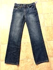 size 14 regular, zipper fly, no stretchy, pockets, adjustable waist Length down the side of leg: 37" Width around bottom of leg: 14" Rise: 9"