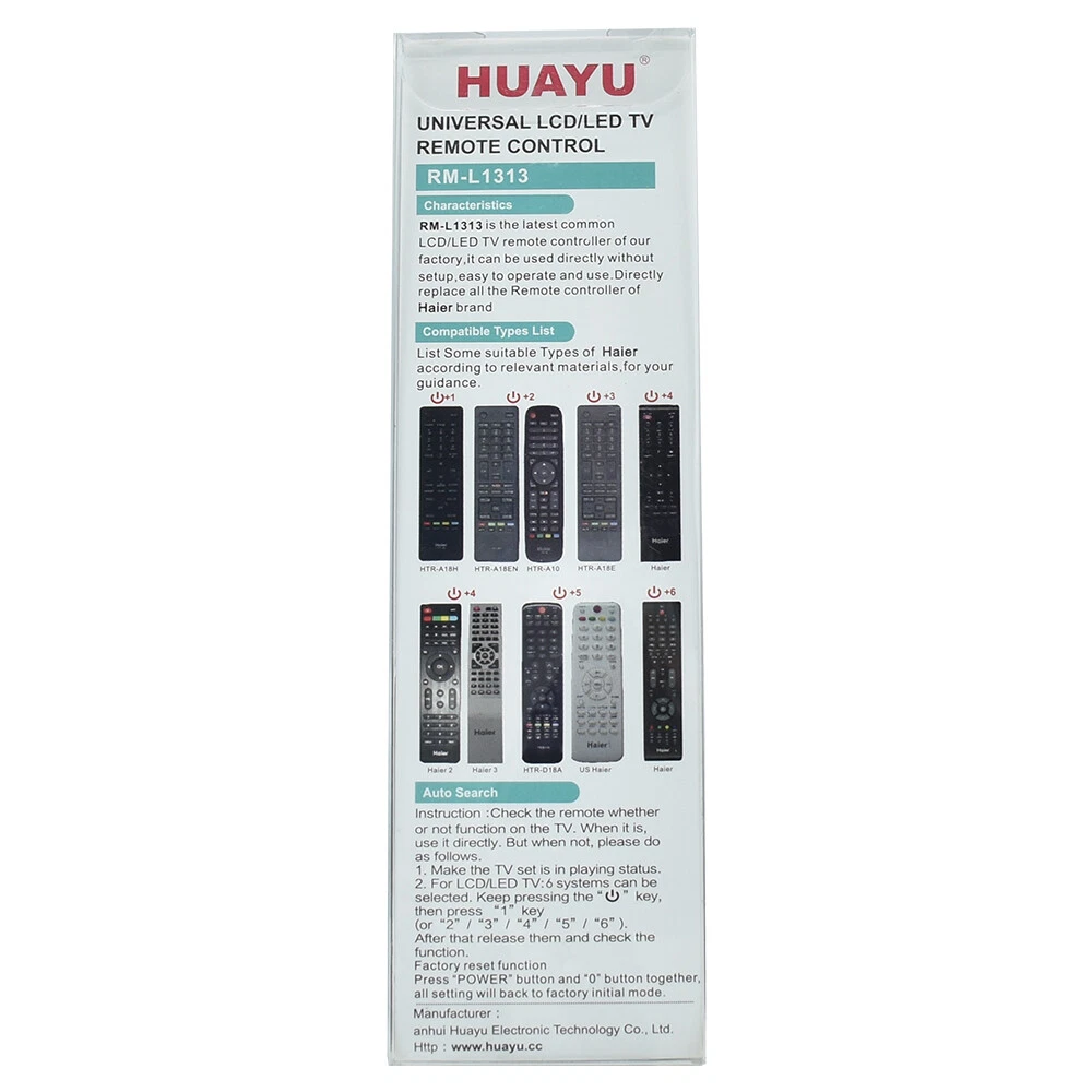New HUAYU RM-L1313 Universal For Haier TV Remote Control HTR-A18EN HTR-A10 A18E Product Description: Model: RM-L1313 Wireless communication: IR Colour: Black Material: ABS Application: For Haier Frequency: 2.40GHz - 2.48GHz Power: 3V / 2 x 1, 5V AAA batteries (not included) Function Description: This product is universal remote control.It can be used directly for most models. Packing about: 1 remote control (battery not included) Payment: 1. We only accept payment methods that cooperate with eBay, such as Paypal. 2.Recommended to use direct online payment. 3. Full payment must be made within 7 days after placing your order, or the order will be invalid or canceled by the system. Delivery details: 1.We Ship to Worldwide(Except for remote areas or logistics that can't be delivered). 2.Items will be shipped within 1 business day on payment received.(Excluding weekends and holidays) 3.Item are shipped from GUANGZHOU using Airmail, reach most of the countries within 10 to 20. 4.Delivery time depends on destination and other factors, it may takes up to 20 business days,or longer time. Terms of sales: 1.Please confirm that it is needed before placing an order for purchase. 2.Some remotes are not compatible, please contact us for confirmation before buying. About us: Our company specializes in Remote Control for most of the brands. We do wholesale and we always provide the best price and quality! Contact us: If you are not satisfied with this transaction for any reason, please contact us before leaving neutral or negative feedback. We will do our best to solve the problem. If you have any questions, concerns, welcome to email us. We will respond within 24-48 hours,If you haven't heard from us in the allotted time, please make sure to check.