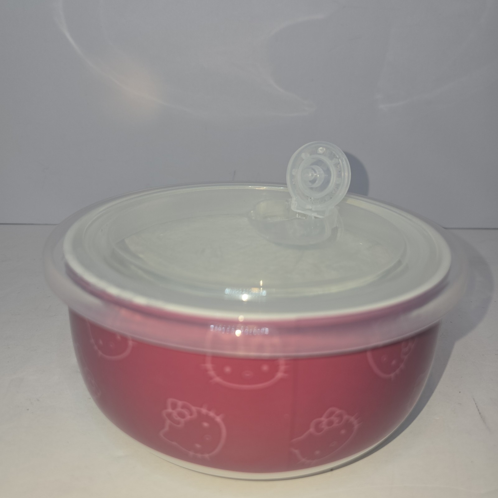 Hello Kitty Ceramic Food Storage Bowl/Container in dark pink is a charming addition to any kitchen or dining area. This round serving bowl features the iconic Hello Kitty character design in white on a pink ceramic exterior. Its dishwasher safe feature makes it both convenient and easy to clean. The Hello Kitty theme adds a whimsical touch to mealtime, making it a fun and stylish choice for storing and serving food.