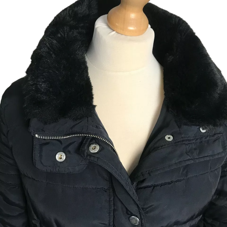 Fabulous lightweight black quilted coat with a faux fur trimmed collar from New Look, size 12. It has two front pockets and a front zip fastening with additional silver coloured poppers to cover the zip and really keep the weather out! Beautiful, warm and smart, it can be worn over any outfit in colder weather. Measurements Bust 40" Length 23" If you have any questions, I would be happy to help. Thanks for viewing!