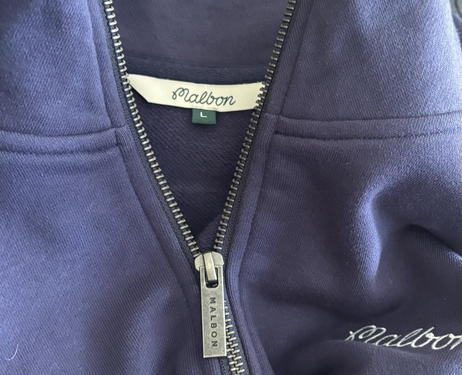 Brand New MALBON GOLF Collegiate Golf Pullover in Navy Great quarter-zip sweatshirt crafted from 100% soft cotton, designed for both casual wear and technical golf performance. Features white embroidered script on the left chest and a signature logo on the right sleeve. Includes ribbed cuffs and hem to ensure a secure fit. Styled as an everyday comfort layer with a functional quarter-zip mock neck Navy Men's size L * Made in the USA – Ensures premium craftsmanship. 100% AUTHENTIC