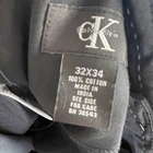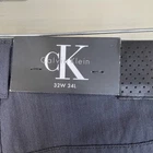 These are new men's Calvin Klein dark grey dress pants in size 34 x 32. They are made of cotton, have a regular fit with a flat front style, and feature a zip closure. Suitable for occasions like weddings, casual wear, workwear, or business attire, these machine washable pants are ideal for all seasons and provide a stylish and comfortable option for men's clothing.