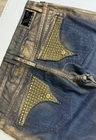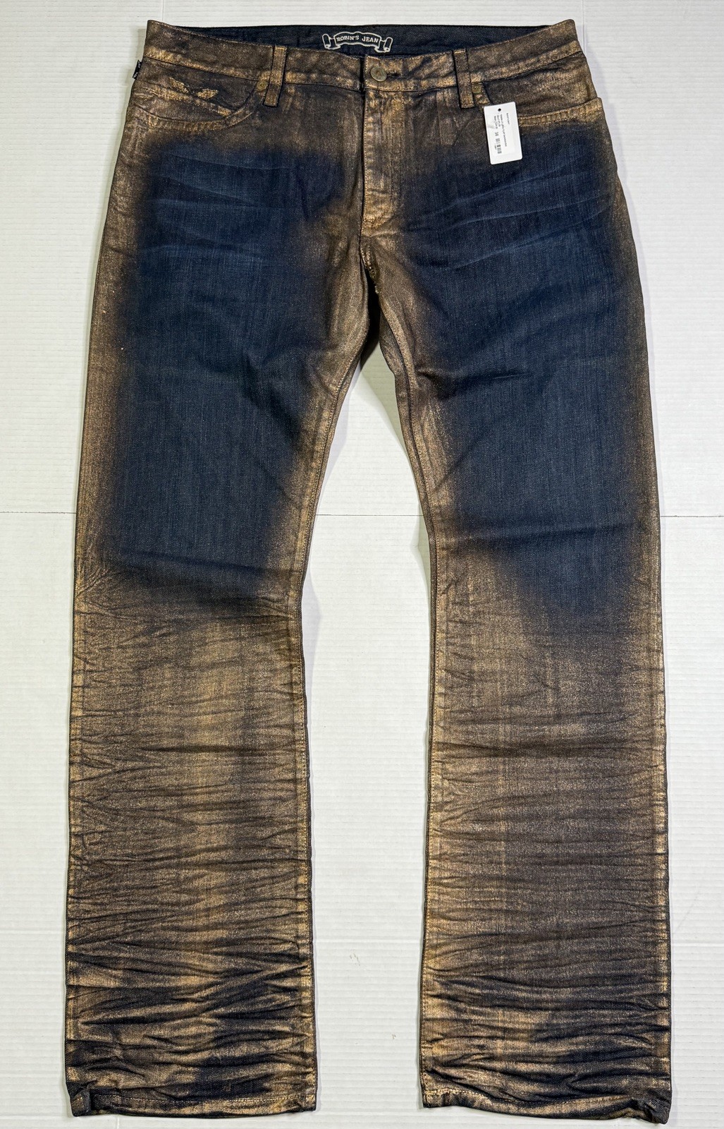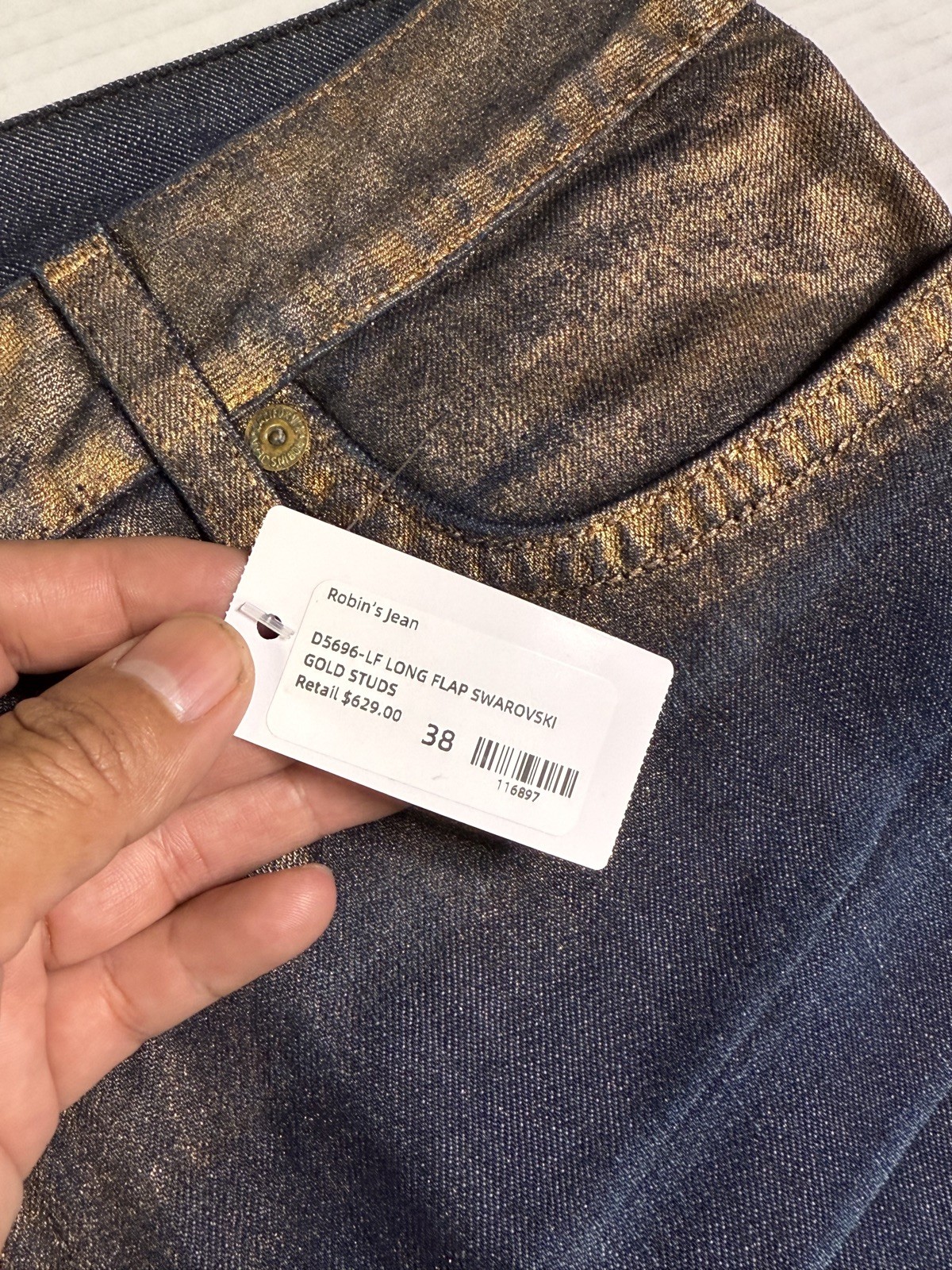 This is Brand New no key chain Men’s Robin’s Jean Size 38 Inseam 35 Style #D5696-LF LONG FLAP Swarovski & Studs Gold Blue Golden Foil Finish RETAIL PRICE $629.00 Buyers this is brand new! Comes with a tag but no key chains 100% authentic Guarantee Smoking free Pet free storage!