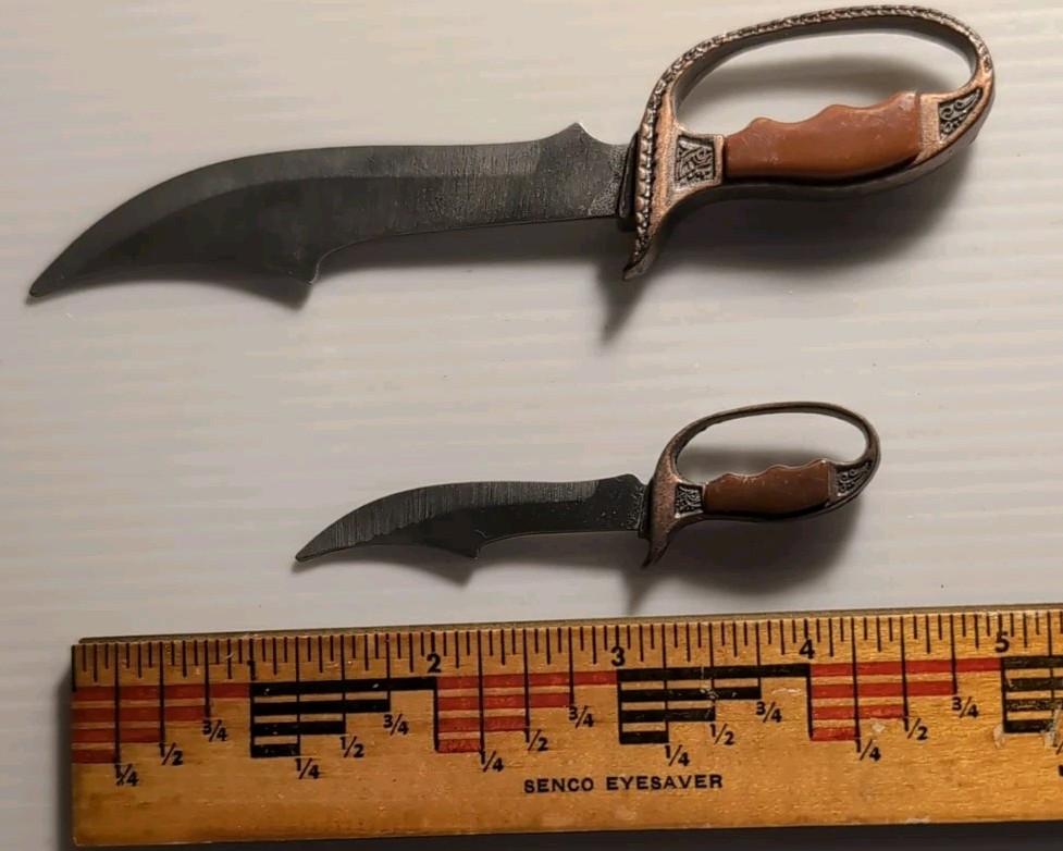 This Mini Double Knife Set features fixed blades made of stainless steel with a full tang and silver color. The set includes two mini pirate swords with blade lengths between 2-3 inches, featuring a plain edge and a plastic handle. Ideal for everyday carry, throwing, boot, or survival use, these knives come with a leather sheath for convenient storage and transport. Perfect for collectors or enthusiasts looking for unique and versatile blade options. See scans to help see the condition.