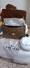 This new Coach Morgan Square Crossbody Bag features a colorblock signature design in khaki multi tones. It has a small square shape with a brown canvas exterior and brown lining. The bag has a brown strap, making it a stylish and colorful accessory for women.