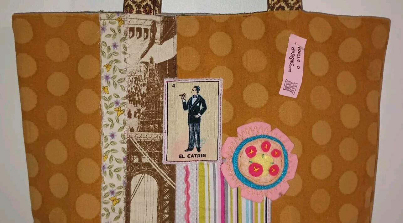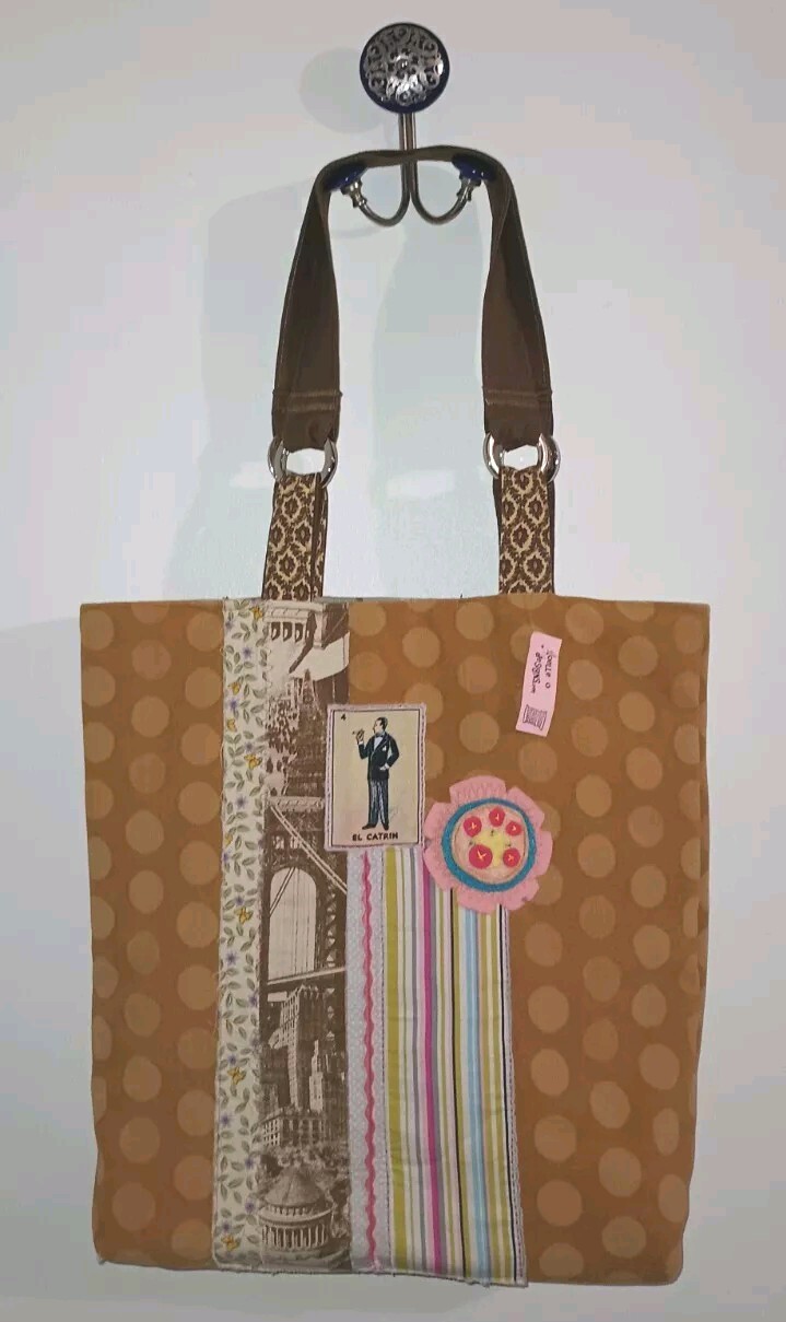 Noelle O Designs "El Catrin" Floral Tapestry Tote Handcrafted in USA New with Tags! 14" x 14" x 3.5" 12" straps drop Beautiful collage of fabrics, textures, patterns and prints. El Catrin classic Mexican loteria applique with vintage tones city strip and contrasting felt floral ornament, magnetic snap closure, two interior side pockets.