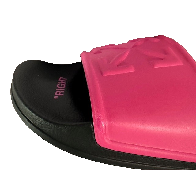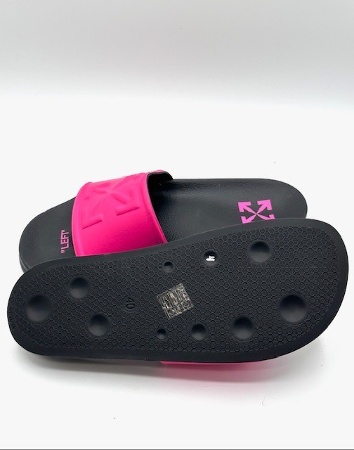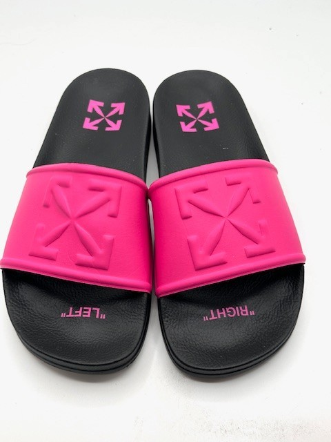 Off-White Women's Pink Arrow Pool Slides Sandals Size 40 New, never worn with slight imperfection: Right shoe on the vamp, a small spot about 1/4 x 1/2 inch that is a little discolored. Great value! Oiginal box not included. SEE PHOTOS! The product is a pair of Off-White Women's Pink Arrow Pool Slides Sandals in size 40 (UK 7, US 10). These slip-on sandals feature a solid pink color with embossed arrows as accents. Made with a textile upper and rubber outsole, these sandals offer cushioned comfort and are perfect for casual occasions during the summer and spring seasons. Designed with a flat heel style and M width, these sandals are a stylish and comfortable footwear choice for women.