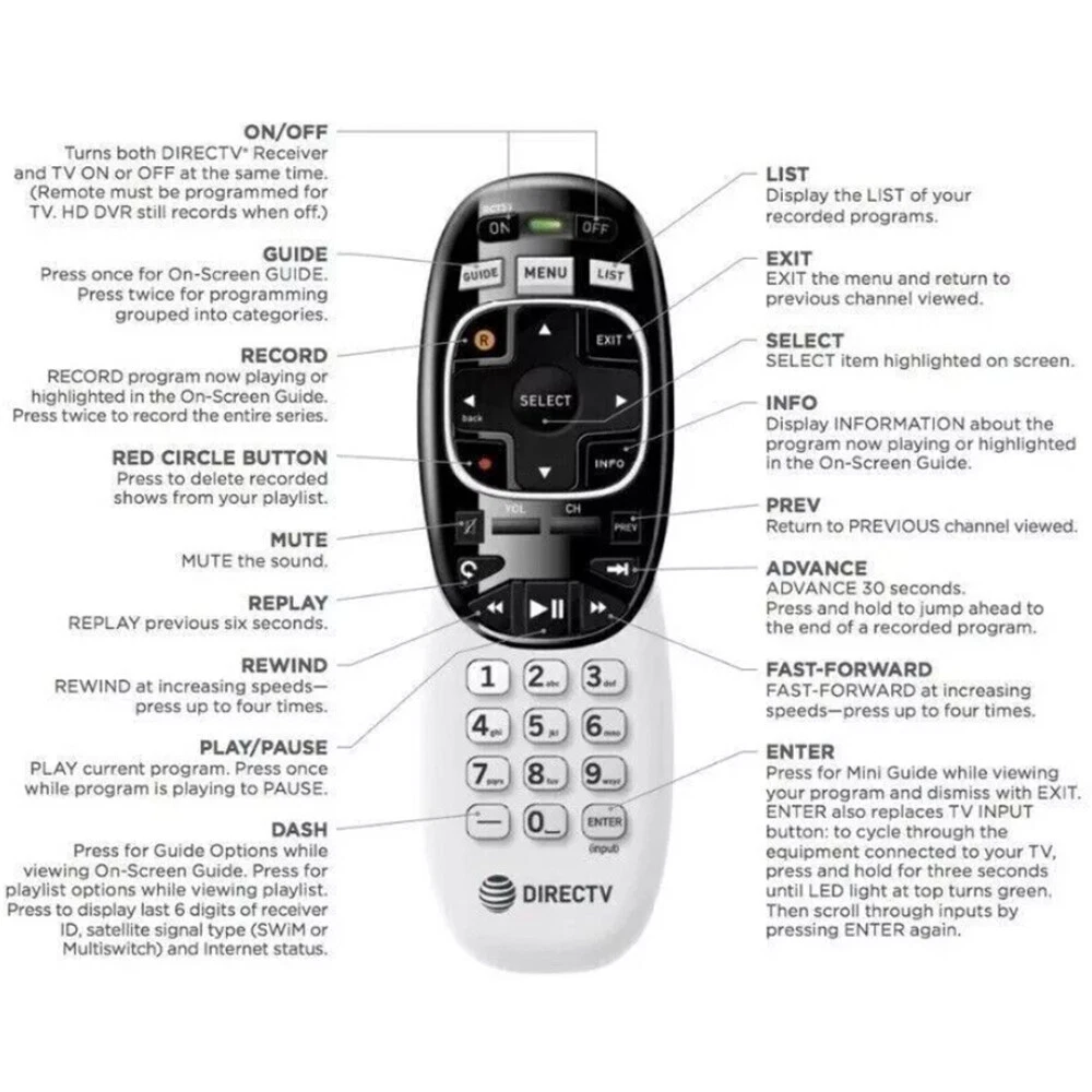 New Original RC73 For DirecTV AT&T IR RF Universal Remote Genie HR44 HR54 C41 Product Description: Model: RC73 Wireless communication: IR Colour: Black Material: ABS Application: For For DirecTV AT&T Frequency: 2.40GHz - 2.48GHz Power: 3V / 2 x 1, 5V AAA batteries (not included) Supplied with models: D10, D11, D12, h20, H21, H23, H24, H25, HR20, HR21, HR22, HR23, HR24, HR25, HR34, HR44, THR22 TiVo, R15, R16, C31, C41 Packing about: 1 remote control (battery not included) Payment: 1. We only accept payment methods that cooperate with eBay, such as Paypal. 2.Recommended to use direct online payment. 3. Full payment must be made within 7 days after placing your order, or the order will be invalid or canceled by the system. Delivery details: 1.We Ship to Worldwide(Except for remote areas or logistics that can't be delivered). 2.Items will be shipped within 1 business day on payment received.(Excluding weekends and holidays) 3.Item are shipped from GUANGZHOU using Airmail, reach most of the countries within 10 to 20. 4.Delivery time depends on destination and other factors, it may takes up to 20 business days,or longer time. Terms of sales: 1.Please confirm that it is needed before placing an order for purchase. 2.Some remotes are not compatible, please contact us for confirmation before buying. About us: Our company specializes in Remote Control for most of the brands. We do wholesale and we always provide the best price and quality! Contact us: If you are not satisfied with this transaction for any reason, please contact us before leaving neutral or negative feedback. We will do our best to solve the problem. If you have any questions, concerns, welcome to email us. We will respond within 24-48 hours,If you haven't heard from us in the allotted time, please make sure to check.