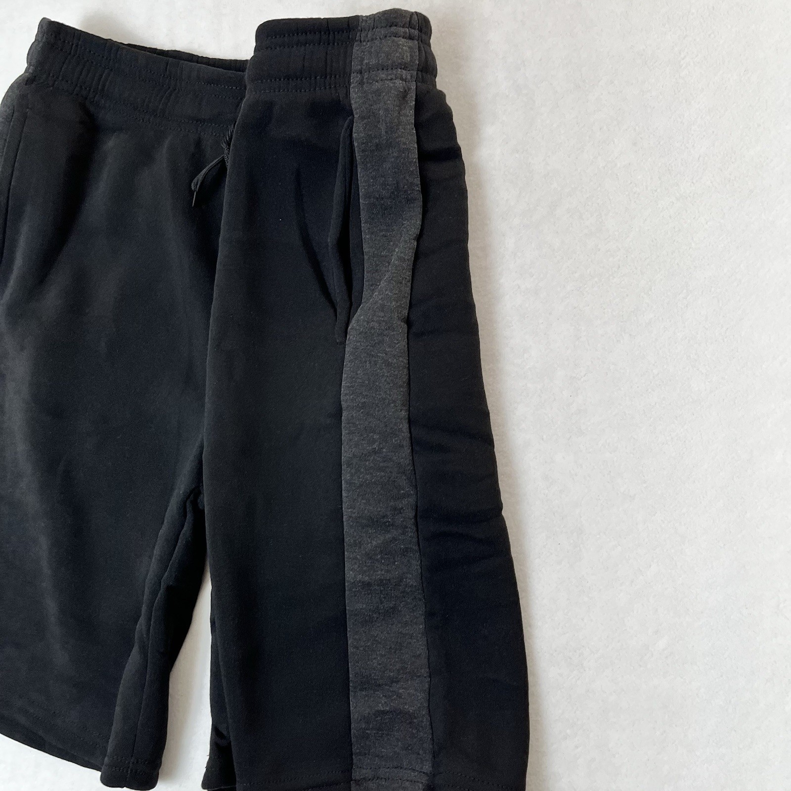 1041 Real Essentials brand Men's Size Medium Athleisure Shorts Workout, Activewear, Sports, Lounge, Casual Pockets; Drawstring Closure; Elastic Waist Black with vertical gray stripe/side panels New without tags