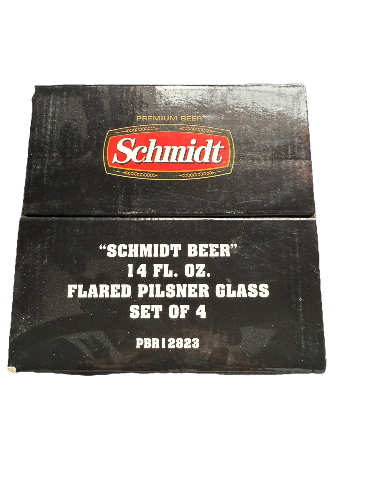 This set of 4 vintage Schmidt beer pilsner glasses is perfect for any man cave or bar decor. Featuring the iconic Schmidt brand, these glasses are sure to be a hit with any beer enthusiast. The pilsner style adds a touch of breweriana to the collection, making them a unique and nostalgic gift for any man who appreciates classic beerware. Cheers to enjoying a drink in style with these charming vintage glasses.