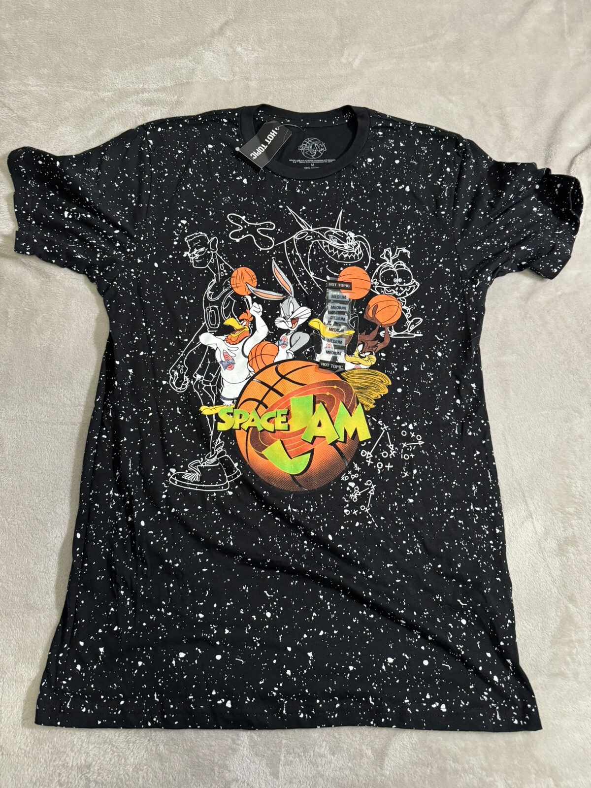 Get ready to show off your love for the classic movie Space Jam with this stylish t-shirt! Featuring a bold graphic print, this black tee is perfect for any fan of the film. Made from high-quality materials, this t-shirt is designed for comfort and durability. Available in a men's medium size, this regular fit t-shirt is suitable for any casual occasion. Whether you're heading out to meet friends or running errands, this Space Jam t-shirt is sure to make a statement. So why wait? Add this must-have tee to your wardrobe today!