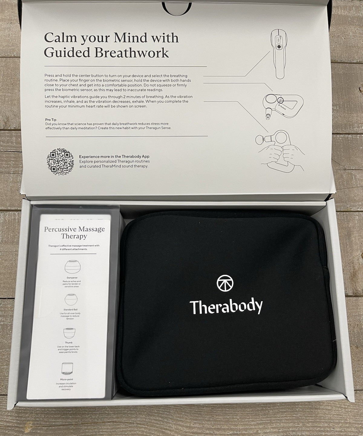 Theragun Sense New in box 4 Massage attachments: -Standard Ball -Dampener -Thumb -Micro Point USB-C charging cable Travel Pouch MSRP $299.99 Please ask any questions before purchase