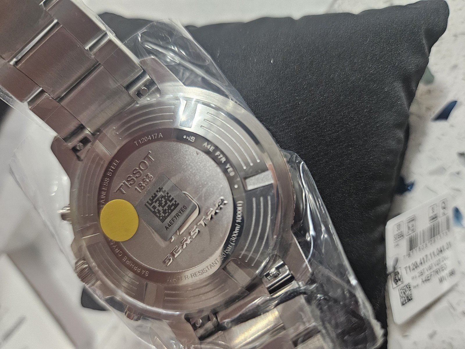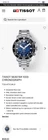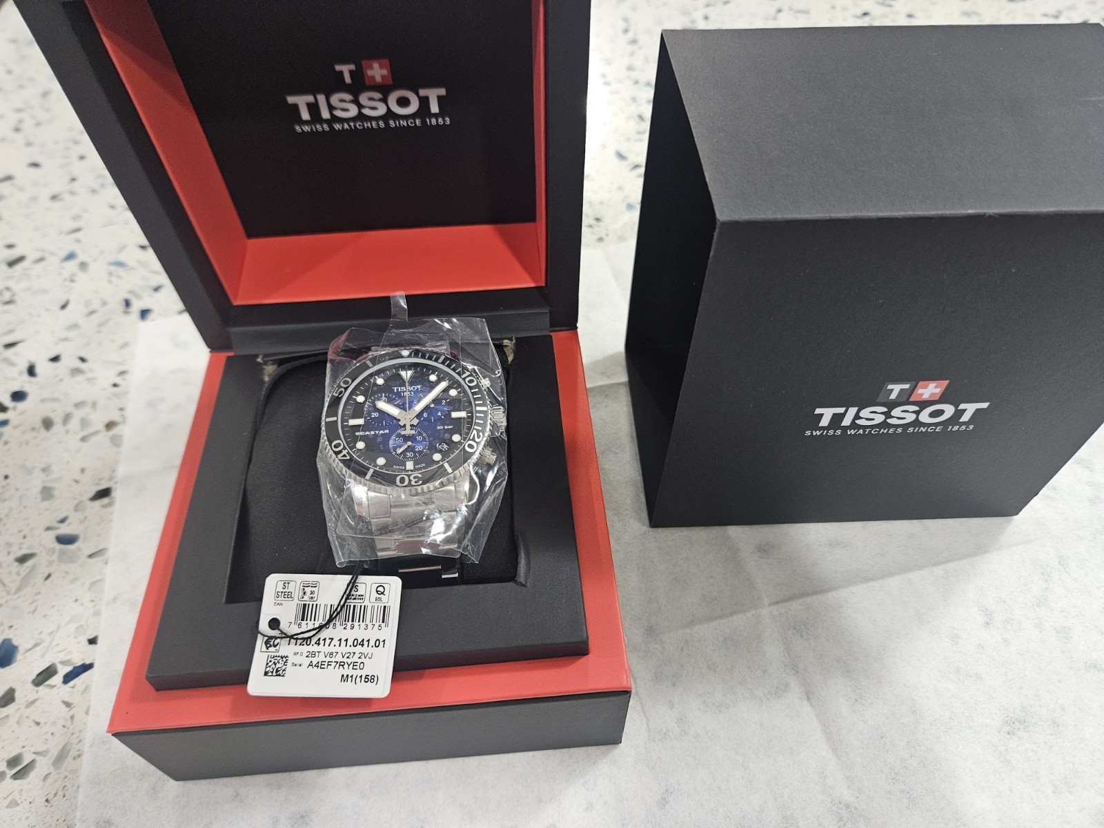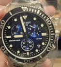 The product is a Tissot Seastar 1000 wristwatch with a blue bezel and stainless steel case and band. It features a unidirectional rotating bezel, QUARTZ movement, water resistance up to 300 meters, and a chronograph function. The luxury, dress, or formal style watch comes with a 2-year manufacturer warranty, original box and packaging, and manual/booklet. With a round watch shape and analog display, this Swiss-made timepiece is designed for men with a 8.1-8.25-inch wrist size.