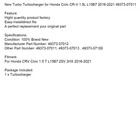 A Fantastic Shop Send us a message Our Store Seller Profile Feedbacks Save this seller Contact New Turbo Turbocharger for Honda Civic CR-V 1.5L L15B7 2016-2021 49373-07011 US New Turbo Turbocharger for Honda Civic CR-V 1.5L L15B7 2016-2021 49373-07011 Feature: Hight quantity product factory Easy-installdirect fits A perfect replacement your original part Specifications: Condition: 100% Brand New Manufacturer Part Number: 49373-07012 Other Part Number: 49373-07011, 49373-07013 , 49373-07100 Fitment: For Honda CRV Civic 1.5 T L15B7 2SV 2HX 2016-2021 Package included: 1 x Turbocharger About US About Our Items We strive to describe all items accurately and thoroughly, with the utmost care and attention to detail. However, to ensure a mutually satisfactory transaction, we kindly ask for your assistance in thoroughly reviewing the item description and photos, and addressing any questions before placing a bid. Customer Satisfaction We stand behind our commitment with exceptional service, a 100% money-back guarantee, and a dedication to customer satisfaction. I am readily available to address any inquiries or concerns you may have, both before and after your purchase. Our aim is to ensure your shopping experience is enjoyable and that you're delighted with your purchase. Feedback Your feedback is crucial to our business's success. If you're satisfied with your purchase and the service you received, we would greatly appreciate your positive feedback, along with an overall Detailed Selling Rating (DSR) of 5. Please take a moment to leave us positive feedback. Our eBay account is set up to automatically reciprocate positive feedback once yours is received. If you're considering leaving neutral/negative feedback or opening an eBay/PayPal case, we encourage you to reach out to us immediately. We're committed to resolving any issues to the best of our ability. Shipping Parcel will be shipped using Standard shipping method. For security purposes, items will be shipped exclusively to the confirmed address on Paypal. Please ensure your Shipping address is up to date before proceeding with payment. Estimated delivery time within the United States ranges from 3 to 10 business days, depending on your location. Returns We accept returns within 60 days from the date the buyer receives the item. If the item is found to be defective upon receipt, the customer has up to 30 days from the date of receipt to request an exchange for a new item or a refund. For returns due to a change of mind, we accept items in their original selling condition. However, if the package has been opened due to a mistaken order, it does not qualify for our return policy. Please note that the buyer is responsible for covering the cost of return postage. If you encounter any issues, please reach out to us via eBay message, and we'll respond within 24 hours.