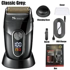 Specifications: Best for hair, beard, stubble, shaved head bump free shaving and super close shaving clean up hair and neck lines for smooth finish cord/cordless shaver shaper a great tool for an extra-close shave on the neck,face and all around the hairline 100-240V voltage,50/60Hz Cord/cordless work powerful and quiet rotary motor gold titanium hypoallergenic foil for irritation-free shaving 2 blade cutting shaving system 600mAh Lithium-ion battery LCD display, charging reminder, battery power percentage reminder contains travel lock function, press and hold the switch for 3 seconds, the machine will be locked, if unlocked, do the same operation USB Line charger model Package Included: 1* T rimmer 1* Protective cover 1* C harger 1* Cleaning brush 1* Manual INSTRUCTIONS FOR USE : 1. Men whose skin is sensitive or easily irritated by shaving, or who suffer from a skin allergy, should test one section on the leg or arm before using the shaver. 2. Remove the protective cover and turn on the unit to start shaving. Hold the shaver at a right angle to the area of your face that you want to shave and run the single shaving foil carefully along your skin. Tip: In general, we recommend that you shave against the direction of hair growth, as this is the best way to trim the hair. Pull your skin tight, with your fingers in inaccessible areas, to achieve optimum results. 3. Do not push the shaver on the skin too hard as it could cause irritation, make the shaver warm and prevent a perfect shave. 4. Please note that it takes 2 to 4 weeks for your skin to adapt to a shaver, so please do not change shaving instruments in this period of time. 5. If hair is longer than 1/32” begin by cutting the hair down first with a trimmer, then use shaver for a smooth close finish.
