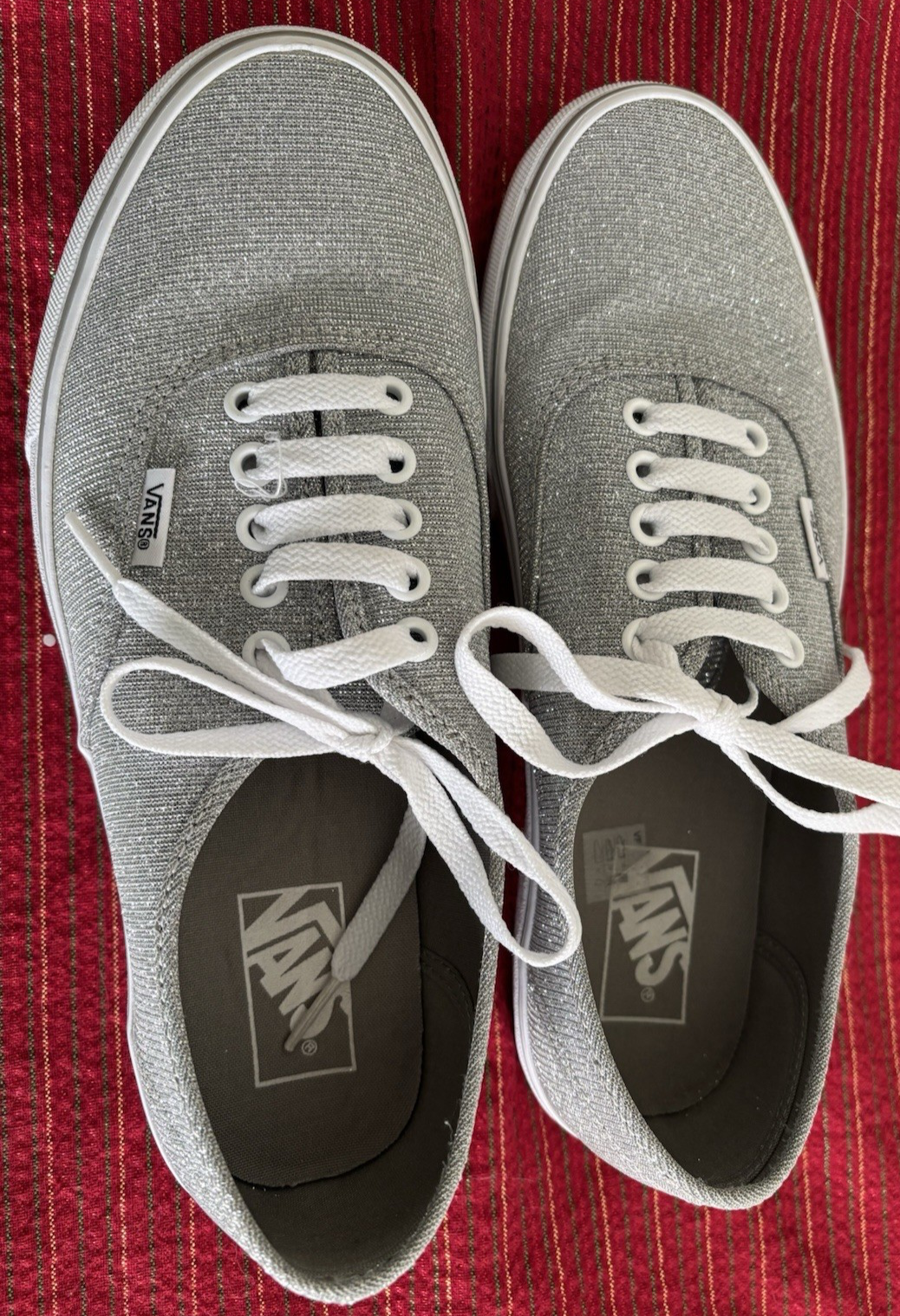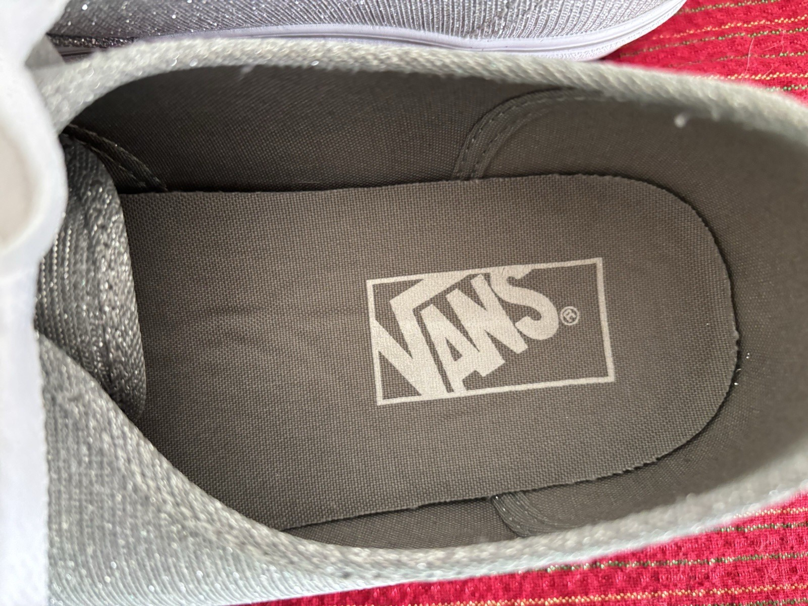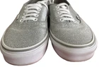 The new Vans silver shimmer athletic shoes are a stylish and versatile option for both women and men. Featuring a solid silver sparkle pattern and lace-up closure, these sneakers are perfect for activewear or casual everyday wear. Made with vegan fabric upper and rubber outsole, they offer both comfort and performance for walking or everyday activities. The unisex adults size makes them suitable for a wide range of individuals, and the iconic Vans brand ensures quality and style in every step. Great for prom or wedding. New without box.