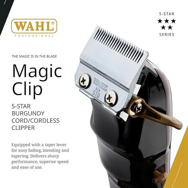 New1 Wahl Professional 8148 5-Star Series Cordless Magic Clip Cord / Clipper PROFESSIONAL PRECISION: 5-Star Magic Clip is a heavy duty, adjustable 5-Star corded, or cordless commercial grade hair clipper meant for cutting thick hair and is perfect for blending and fades STYLISH AND FUNCTIONAL: The 5-Star Magic Clip features high precision, zero-overlap blades, a taper lever for easy fading and blending, and a lithium ion battery for a 90+ minute run time per charge ACCESSORIES INCLUDED: The clipper, 8 attachment guides (1/8”, ¼”, 3/8”, ½”, 5/8”, ¾”, 7/8”, & 1”), charging transformer, styling comb, brush, blade oil, red blade guard, and operating instructions PRODUCT SPECIFICATIONS: The Cord/Cordless 5-Star Magic Clip is an electric haircutting machine that measures 6.25” long and weighs only 10 ounces; power frequency: 120 Volt - 60 Hertz New open box A Little Something Extra This clipper comes with a fine clipper brush that can be used to remove stray hairs or other unwanted dust off your clipper to achieve a cleaner shave, as well as a blade guard to secure your clipper blade. Also included is blade oil that prevents rust from forming & helps extend the life of your blades. Finally, this package also comes with a versatile styling comb that is ideal for cutting/trimming hair of all kinds.