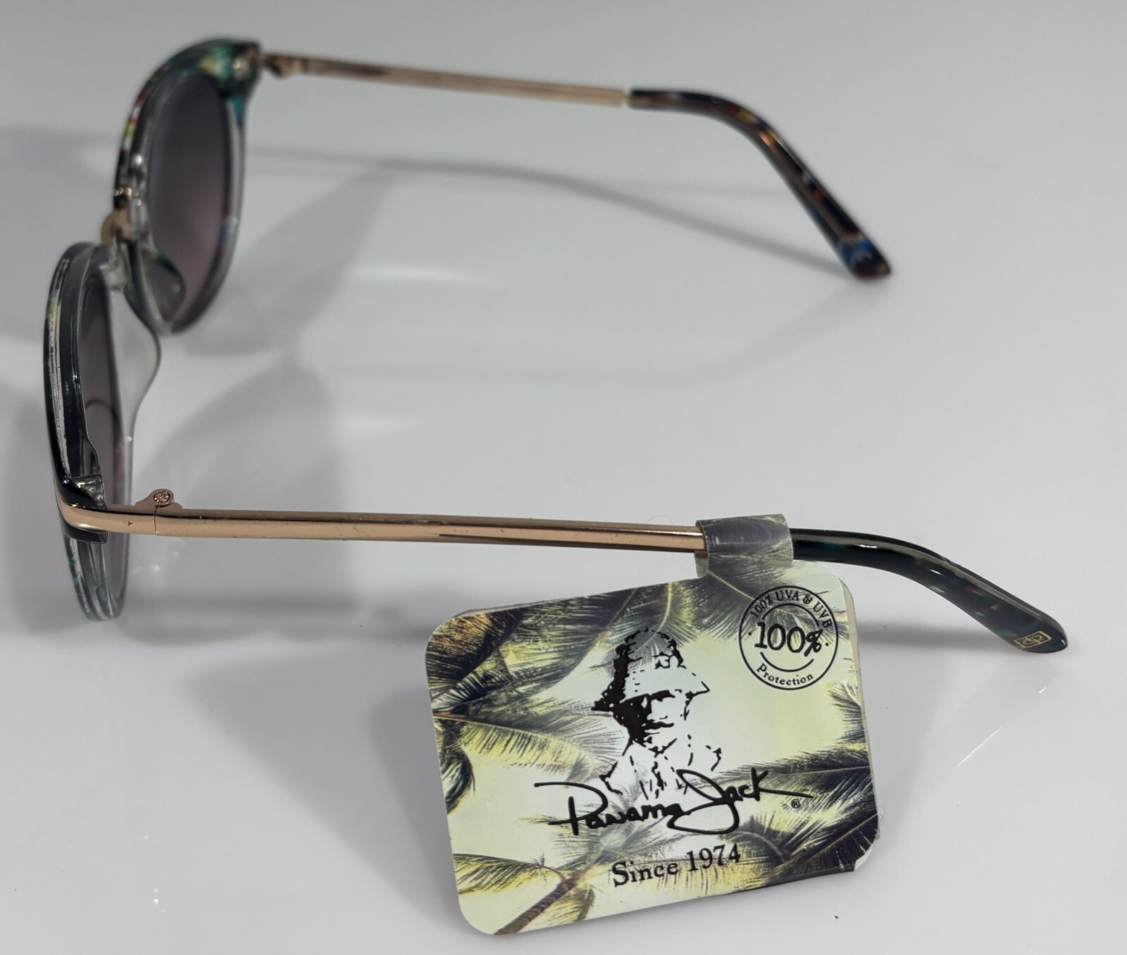 Elevate your fashion game with these stunning Panama Jack sunglasses. The gold plastic frame is adorned with a clear marble pattern in green, brown, and yellow hues, giving it a unique and designer look. The purple mirrored lenses provide 100% UVA/UVB protection, making them both fashionable and functional. These sunglasses are perfect for women who love to make a statement with their accessories. The confetti-themed design adds a touch of playfulness to any outfit, while the polycarbonate lens material ensures durability and longevity. Wear these sunglasses to any occasion and effortlessly turn heads.