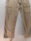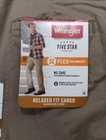 These new Wrangler cargo pants for men in size 32x30 are designed for comfort and functionality. The brown pants feature a relaxed fit with a button closure and fly zipper. Made from a cotton blend fabric with flex technology, they flex with your movements and sit at your natural waist. The pants include multiple pockets, including cargo pockets, hidden tech pocket, and other slash and welt pockets. These pants are suitable for various occasions from casual to workwear.