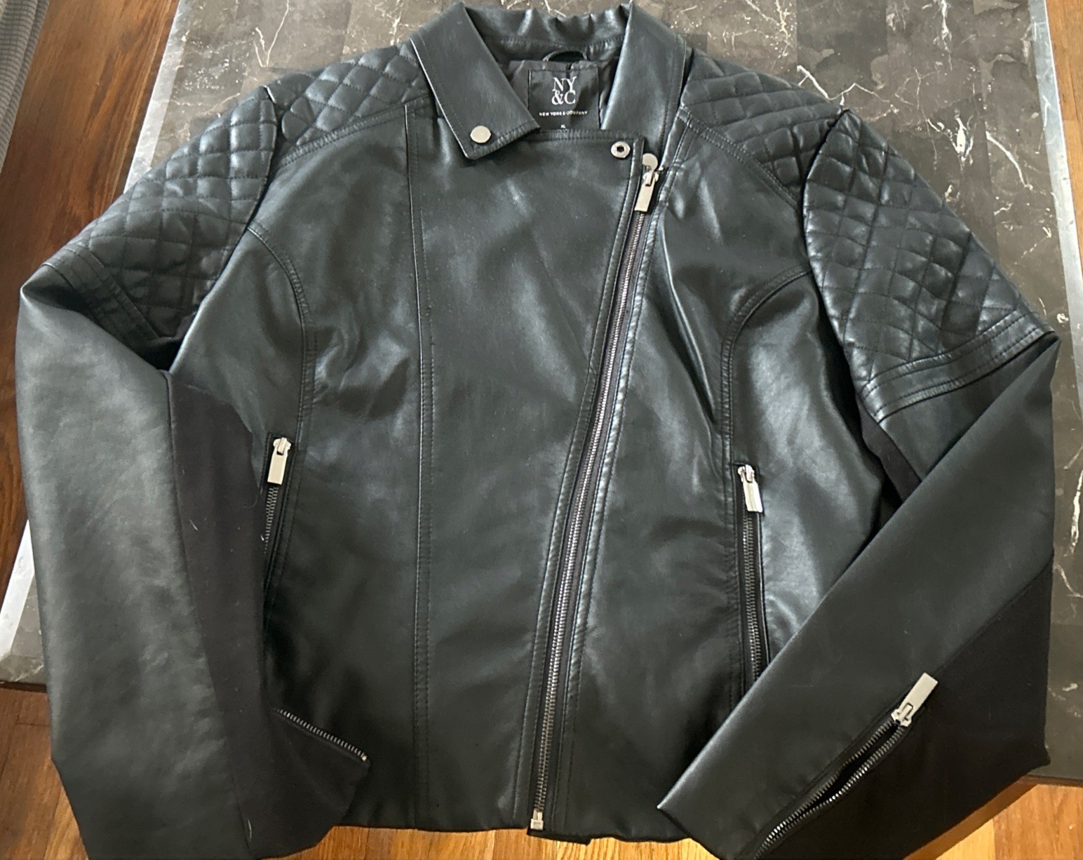 This New York & Company Biker Jacket is a stylish and edgy addition to any woman's wardrobe. Made from faux leather with a zip front closure, it exudes a cool and bold biker theme. The size XL is perfect for a regular fit, and the sleek black color makes it versatile for any outfit. Designed for women who want to make a statement, this motorcycle jacket is sure to be a favorite go-to piece for any occasion.
