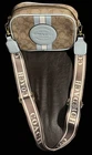 This Coach New York bag in brown and sky blue with a strap features a logo pattern, zip closure, and small size. Made from a cotton blend, it includes inner pockets and an adjustable strap for added convenience. The exterior is a brown color with brown hardware accents, making it a stylish and versatile accessory for any woman's wardrobe. Perfect for everyday use or special occasions, this Coach bag is a timeless piece with a colorful and designer touch.