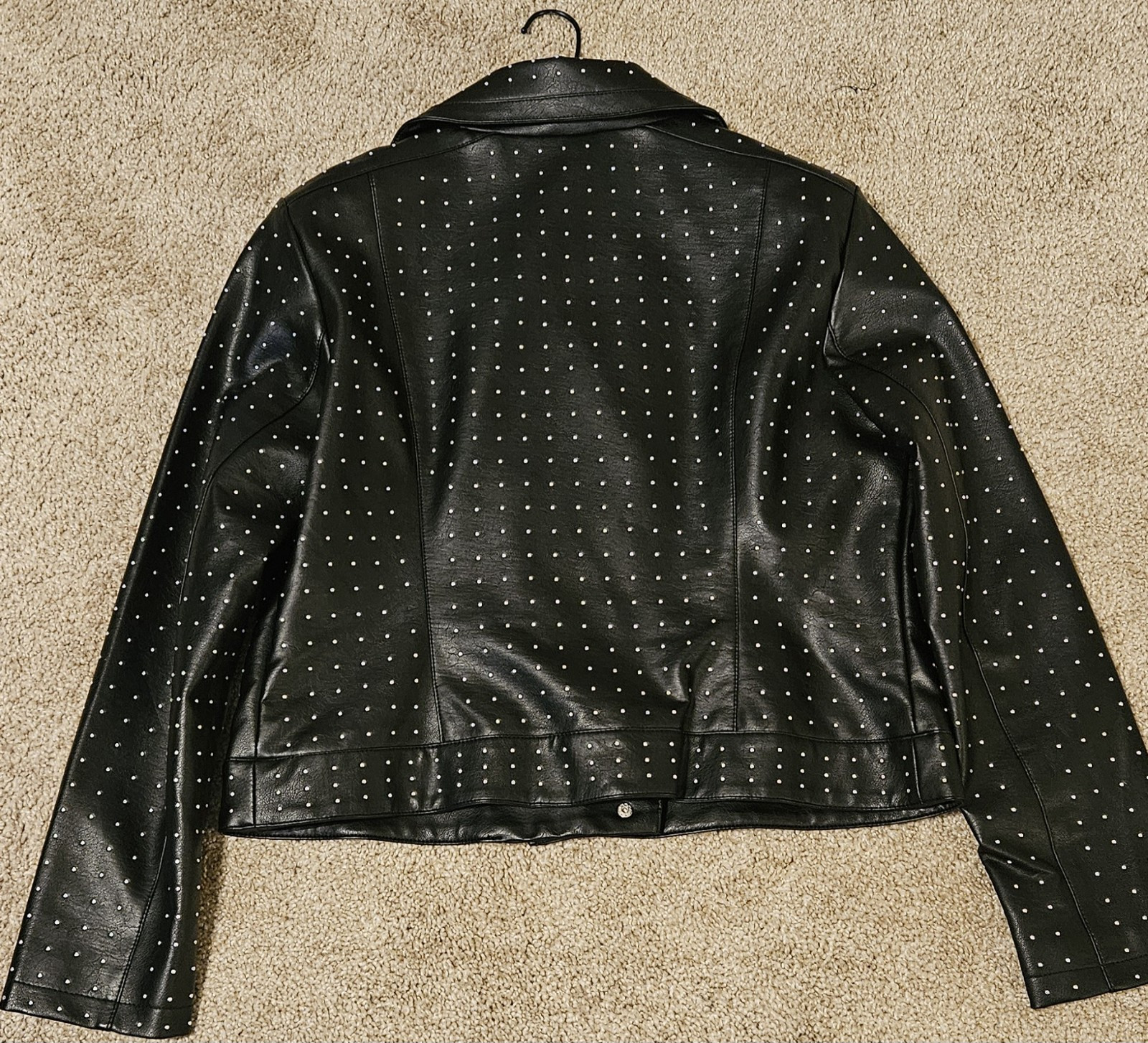 This New York & Company faux leather jacket for women in size XL features a studded pattern, zip closure, and polyester lining. Size: XL Color: Black Studded detail design Material: Faux Leather Condition: Like new without tags No flaws or stains Gorgeous jacket The motorcycle-style jacket is black with accents like studs, buttons, and zippers. It is suitable for travel, parties, or casual wear, and is lightweight and insulated for winter, fall, and spring seasons. Perfect for a biker or motorcycle theme, this jacket adds a touch of 90s style to your wardrobe. Measurements: Armpit to waist: 12 inches Shoulder to wrist: 24.5 inches Chest width: 17 inches Sliver zipper hardware