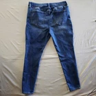 The product is a pair of New York & Company women's jeans in a size 14, featuring a dark wash mid-rise skinny fit. Made from a blend of spandex, Repreve cotton, and cotton denim, these jeans offer stretch for added comfort and flexibility. The solid blue color and mid-rise design make them a stylish and versatile addition to any wardrobe. With a slim fit and pockets for added convenience, these jeans are perfect for everyday wear.