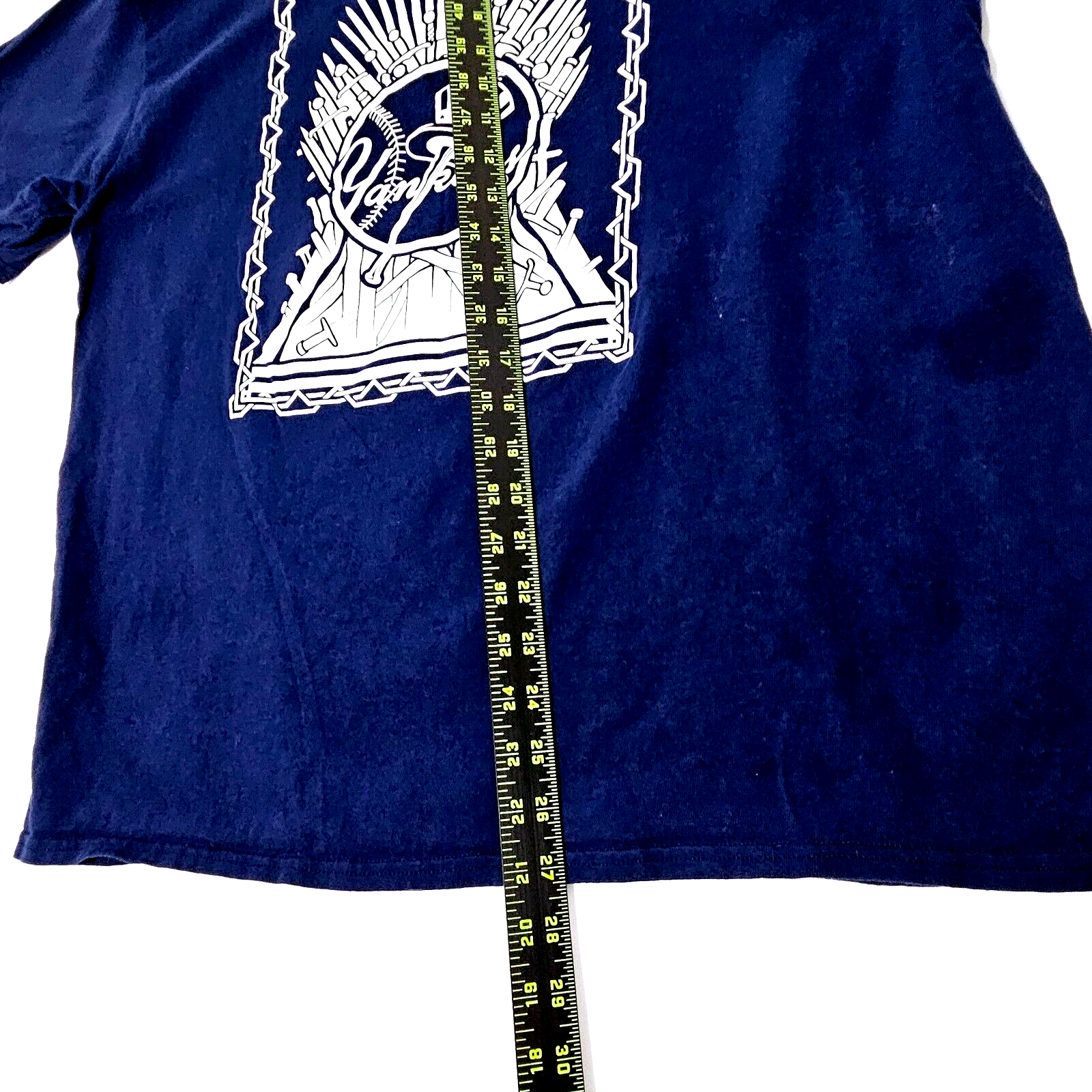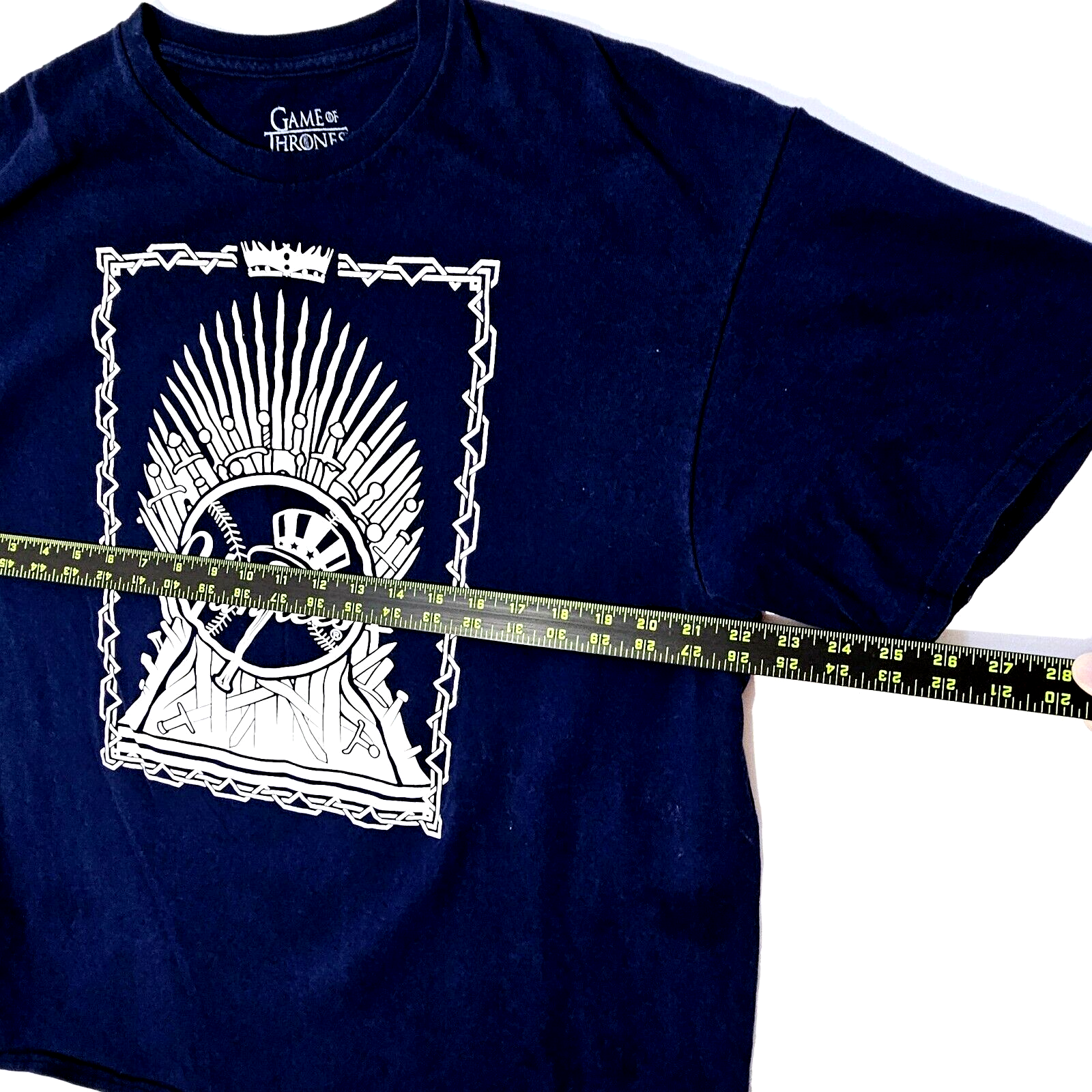 new york yankees baseball with the game of thrones swords very cool on the blue tee. short sleeve tee shirt is in very good clean condition. sz xL MEASURES FLAT 21" SLEEVES 22" PIT TO PIT 27" length