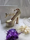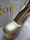 Elevate your style with these stunning gold platform shoes from Joia. These heels feature a square toe and a very high block heel with a platform height of 2 inches, perfect for any occasion from weddings to casual outings. The faux leather upper material is adorned with glitter accents and comes in a UK shoe size 4 These vintage-inspired shoes are suitable for all seasons, including winter, autumn, summer, and spring. The buckle closure ensures a secure fit, while the high feature adds an extra boost of confidence. These shoes are ideal for those who want to make a statement with their footwear and are a great addition to any wardrobe. Heel height is 6" platform height is 2"