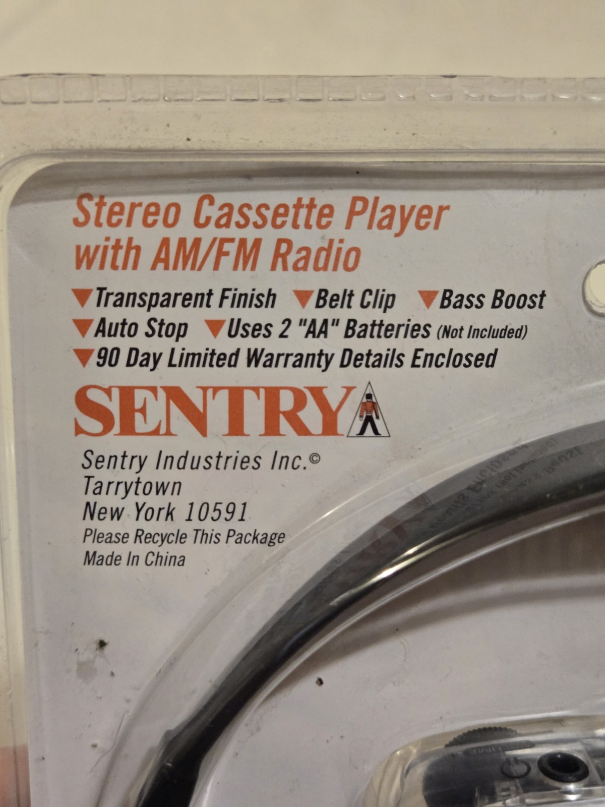 The Sentry TR792 clear portable walkman cassette tape player is a brand new, sealed personal cassette player that features a headphone jack for private listening. This portable cassette player is designed to play cassette tapes and offers a sleek clear color. With AM/FM capabilities and a Walkman product line, this cassette player provides a nostalgic listening experience on the go. Perfect for music lovers looking to enjoy their favorite tunes on cassette tapes, this portable player is both stylish and functional.