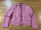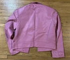 This Newport News Vintage 90s Pink Leather Jacket is a stylish and trendy piece with a retro vibe. Made of genuine leather in a cropped blazer style, it features a solid pink color, long sleeves, and a classic fit in size 4. The jacket has a full zip closure, zipped pockets, collarless design, and a nylon lining for added comfort. With accents like a zipper and a vintage look, this jacket is perfect for casual occasions and offers a designer, Y2K-inspired style from the 90s.