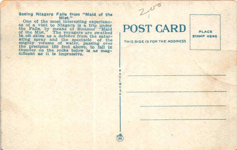 MAKE AN OFFER. THE MORE YOU BUY THE BETTER DEAL I WILL ACCEPT The postcard describes the experience of taking a trip on the Maid of the Mist at Niagara Falls. The Maid of the Mist is a boat tour that takes visitors close to the base of the American and Horseshoe Falls, allowing them to experience the power and beauty of the falls up close.