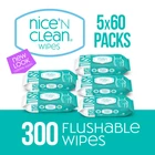 Product details Flushable wipes with aloe and vitamin E Softer than regular toilet paper Septic-safe flushable wipes made with Eco Flush Technology and 100% plant-based fiber Wet wipes, flushable in well-maintained sewers and septic systems as a complement to toilet paper Nice 'N Clean Thick and Soft Flushable Wet Wipes are strong, soft wet wipes that can be easily flushed in any well-maintained septic system. Eco Flush technology allows us to make flushable wipes with 100% plant-based fiber that feels great and flushes easily. Our stylish packaging has a resealable Moisture Lock Lid to dispense and store wipes quickly and easily. Nice 'N Clean makes for great toddler wipes to clean up spills or help make potty training easier With this 5-pack of 60 wipes each, you can have a wipe within reach wherever you need one. Truly Flushable Wet Wipes the Perfect Toilet Paper Complement With Nice 'N Clean, you can finally use wet wipes that are softer than toilet paper, flushable, and clean better than toilet paper alone. Thick and Soft Flushable Wet Wipes’ 100% plant-based material and Eco Flush technology make for wipes that are easier to flush than ever. They’re great for everyday use and perfect for potty training These wipes are also proven to pass through sewer systems and are compatible with wastewater treatment plants. Pick up our flushable wet wipes and see what you’re missing out on today Resealable Moisture Lock Lid is Convenient and Discreet These septic-safe flushable wipes aren’t just high-quality and comfortable, they’re easy to use, too All 5 pouches in this 5-pack are equipped with an easy-open resealable dispenser with a Moisture Lock Lid. Anyone can easily open the lid, take a wipe and close it back again with a single hand. Nice 'N Clean flushable wipes work great alongside incontinence products as a simple, discreet package of adult wipes. Hypoallergenic, Alcohol-Free, with Aloe and Vitamin E Rough, scratchy wipes or toilet paper can cause discomfort, dehydrate your skin or even cause an allergic reaction Nice 'N Clean Thick and Soft Flushable Wet Wipes are completely hypoallergenic and alcohol-free. Each wipe is even infused with vitamin E and aloe Nice 'N Clean takes pride in producing quality wet wipes that anyone can use comfortably. Wet Wipes with a Commitment to Sustainability At Nice-Pak Products, Inc. (the maker of Nice 'N Clean), we are committed to caring for your family as well as the Earth. That’s why we design several of our products with gentle and sustainable materials. Nice 'N Clean Thick and Soft Flushable Wet Wipes are made from 100% sustainably-sourced plant-based fibers. They also contain no artificial chemical binders. These practices make the wipes easier to flush, more comfortable to use, and smarter for our planet. Now that’s a flush you can feel good about Ultra Thick and Soft Wet Wipes, Made with Care The Nice 'N Clean Purpose, Helping families stay healthy and well, one wipe at a time. Since founding our family-run company in 1957, we've been guided by a vision to provide gentle yet effective products that meet the specific needs of caring parents, their families, and the environment. When it comes to our loved ones, we only use the gentlest and highest quality pre-moistened wipes. We know that you want the same for yours. Safe for well-maintained sewers and septic. Flush only one wipe at a time. Ultra-thick and soft wet wipes; more comfortable and reliable than toilet paper alone Flushable wipes for a comfortable complement to toilet paper Aloe and vitamin E in every wipe Clean, comfortable toddler wipes perfect for potty training or small spills 5-Pack of wet wipes with 60 wipes each 300 total wipes Easy-to-use, discreetly dispensing wet wipes Perfect for use with incontinence products Not recommended for use in motor homes or basement pump systems