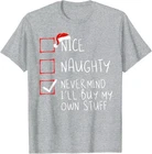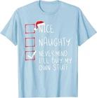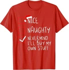 Nice Naughty Never Mind I'll Buy My Own Stuff Christmas List T-Shirt Designed and Printed in USA Product Features: • Classic Look and Feel: This ultra cotton tee offer the timeless appeal of traditional cotton. The high-quality print enhances its casual appearance. • Material: Made from 6.1-ounce, 100% cotton. (Note: Dark Heather variant is 50% cotton, 50% polyester.) • Durability: Features double-needle stitching on the neck, sleeves, and hem for added durability. Designed for a roomy, unisex fit. • Print Type: DTG (Direct to Garment) • Manufacturer: Gildan 5000, 5000b (Made in USA) Shipping Information: • Handling Time: With POD(Print-On-Demand) product model, we typically require about 3 business-days handling time before shipping. In most cases, our handling time’s , rang e from 1-2 business days. • Delivery Time: • USA: Approximately 2 -6 business days • Canada: Approximately 6-10 business days (We currently don’t offer international Shipping) • Worldwide: Approximately 15-25 business days (We Currently don’t offer international Shipping) • Shipping Carriers: USPS and DHL • Note: Business days exclude weekends and holidays. Return & Exchange Policy: • Quality Guarantee: We stand behind the quality of our products and workmanship . Any defects or errors on our part must result in a refund/ replacement at no charge. • Conditions for Returns: Returns are generally not accepted for user errors such as incorrect selection of sizes, designs, or colors. Returns /Replacements are acceptable for damages such as poor printing results, incorrect size or design caused by us. • Note: Please reach out to us if there are any questions or issue s with your item, we’ll do our best to resolve any issue you might have. Note: • We’re glad to have your support! If you have a moment, y our honest feedback is very valuable to us. Thank you!
