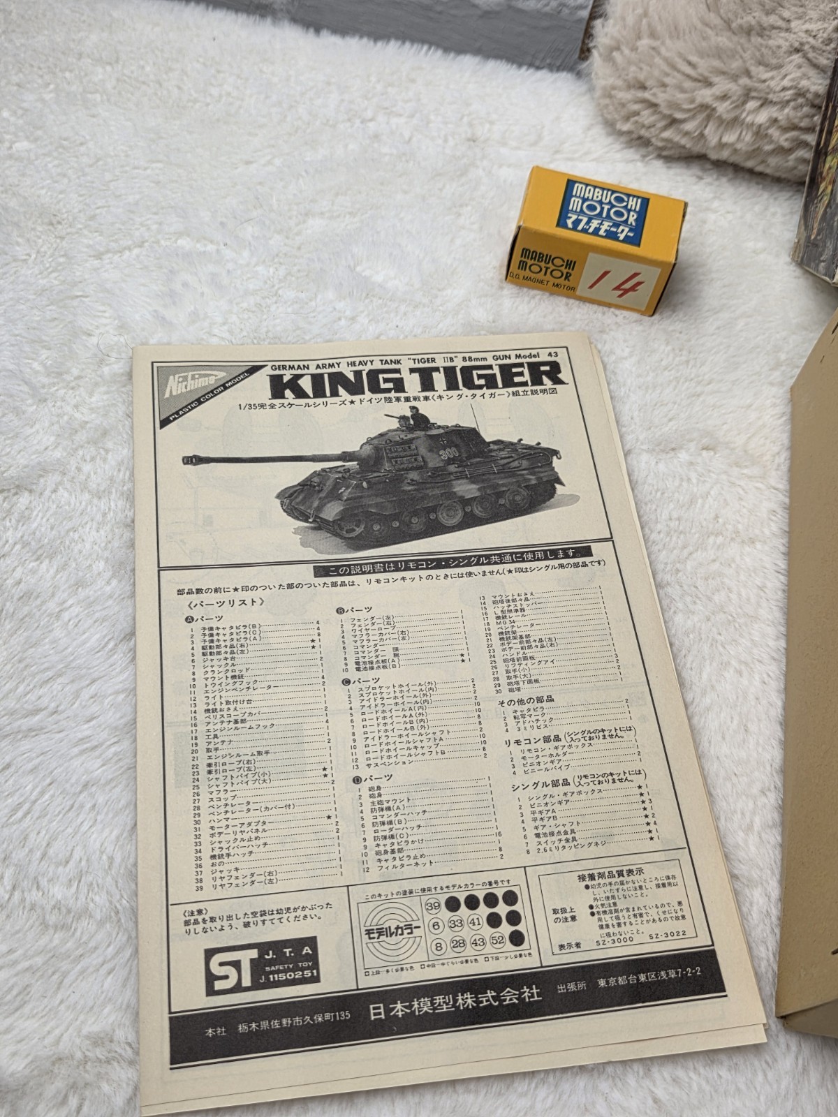 Nichino 1/35 Tiger II Motorized R-3530 Sealed Parts New Power up with this Nichino 1/35 Tiger II Motorized Tank Kit R-3530 — Sealed Parts New ! Rare motorized classic. SEO for "nichino 1/35 tiger ii motorized sealed." 1970s engineering marvel—perfect for running dioramas. Issue Highlights & Kit Breakdown Main Feature: Motor & Gearbox – AA battery drive, metal axles. Historical Profile: King Tiger Henschel – Late turret, zimmerit. Decals: Tactical Numbers – 001 to 334 options. Build Guide: Wiring Harness – Switch and motor install. Pair With: Remote Control – Add modern RC for fun. Vintage Nichino quality—motorize or static. A moving piece of history! Condition Details Sealed Parts New: Motor bag intact; box excellent. Why Collectors Love It Motorized Rarity: Working 70s tech. King Tiger Power: Henschel turret detail. Shipping & Returns 2 Day Shipping Available Upon Request, 30-day returns.