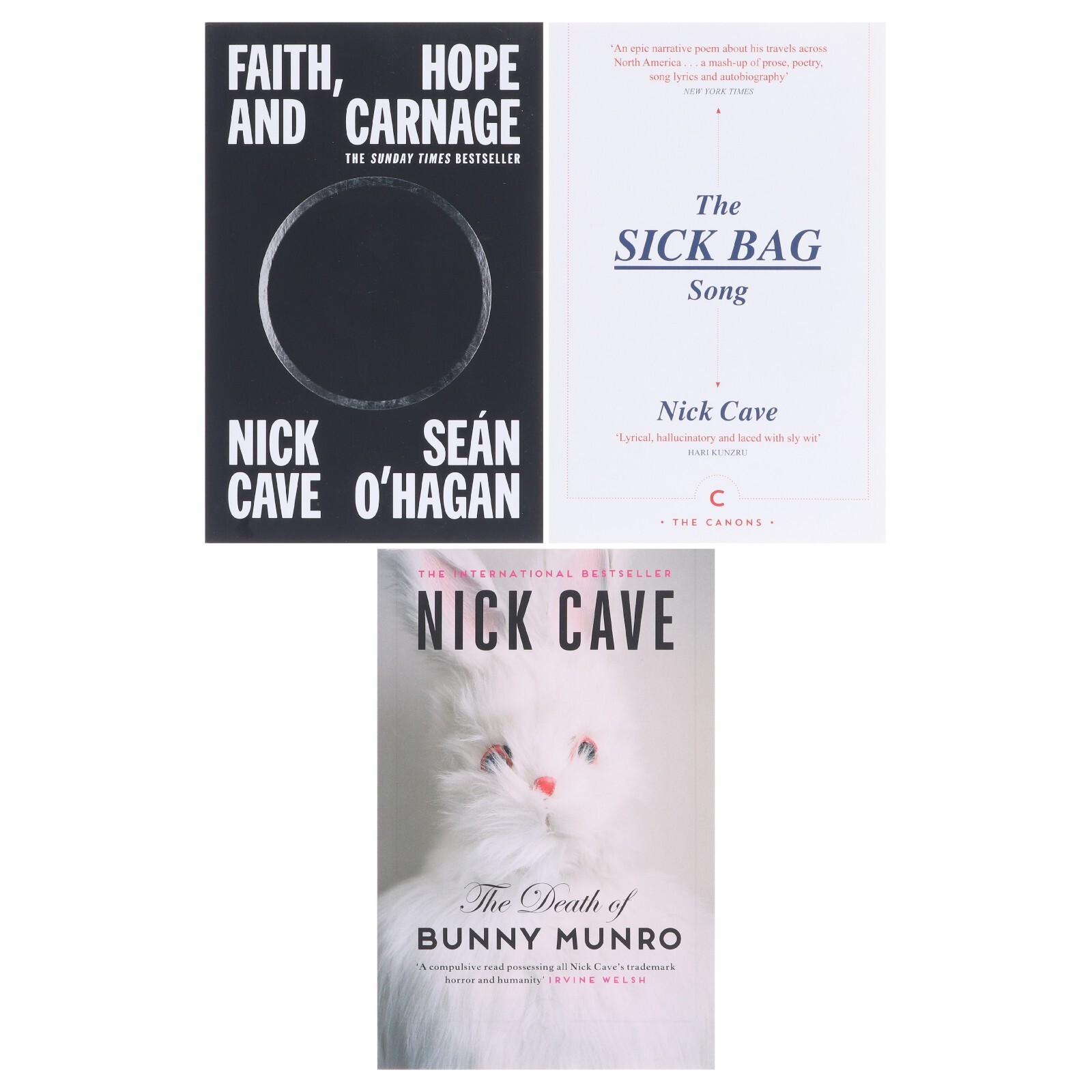 Nick Cave 3 Books Collection Set Titles in this set: 1. The Sick Bag Song 2. Faith, Hope and Carnage 3. The Death of Bunny Munro Description: The Sick Bag Song The Sick Bag Song chronicles Cave's 22-city journey around North America in 2014. Racked by romantic longing and exhaustion, Cave teases out the significant moments - the people, the books and the music - that have influenced and inspired him, and drops them into his sick bag. The book began its life scribbled onto airline sick bags and later evolves into a restless contemporary epic, exploring love, loss, inspiration and memory. Faith, Hope and Carnage Faith, Hope and Carnage is a book about Nick Cave's inner life. Created from over forty hours of intimate conversations with Seán O'Hagan, it is a profoundly thoughtful exploration, in Cave's own words, of what really drives his life and creativity. The book examines questions of faith, art, music, freedom, grief and love. It draws candidly on Cave's life, from his early childhood to the present day, his loves, his work ethic and his dramatic transformation in recent years. From a place of considered reflection, Faith, Hope and Carnage offers ladders of hope and inspiration from a true creative visionary. The Death of Bunny Munro The world is a hard place to be good in... Struggling to keep a grip on reality after his wife's death, Bunny Munro does the only thing he can think of: with his young son in tow, he hits the road. An epic chronicle of one man's judgement, The Death of Bunny Munro is also an achingly tender portrait of the relationship between father and son. Frooition | No-js Template | eBay design, eBay store design, eBay shop design, eBay template design, eBay listing design (ver:froo_no_js) This listing is currently undergoing maintenance, we apologise for any inconvenience caused.