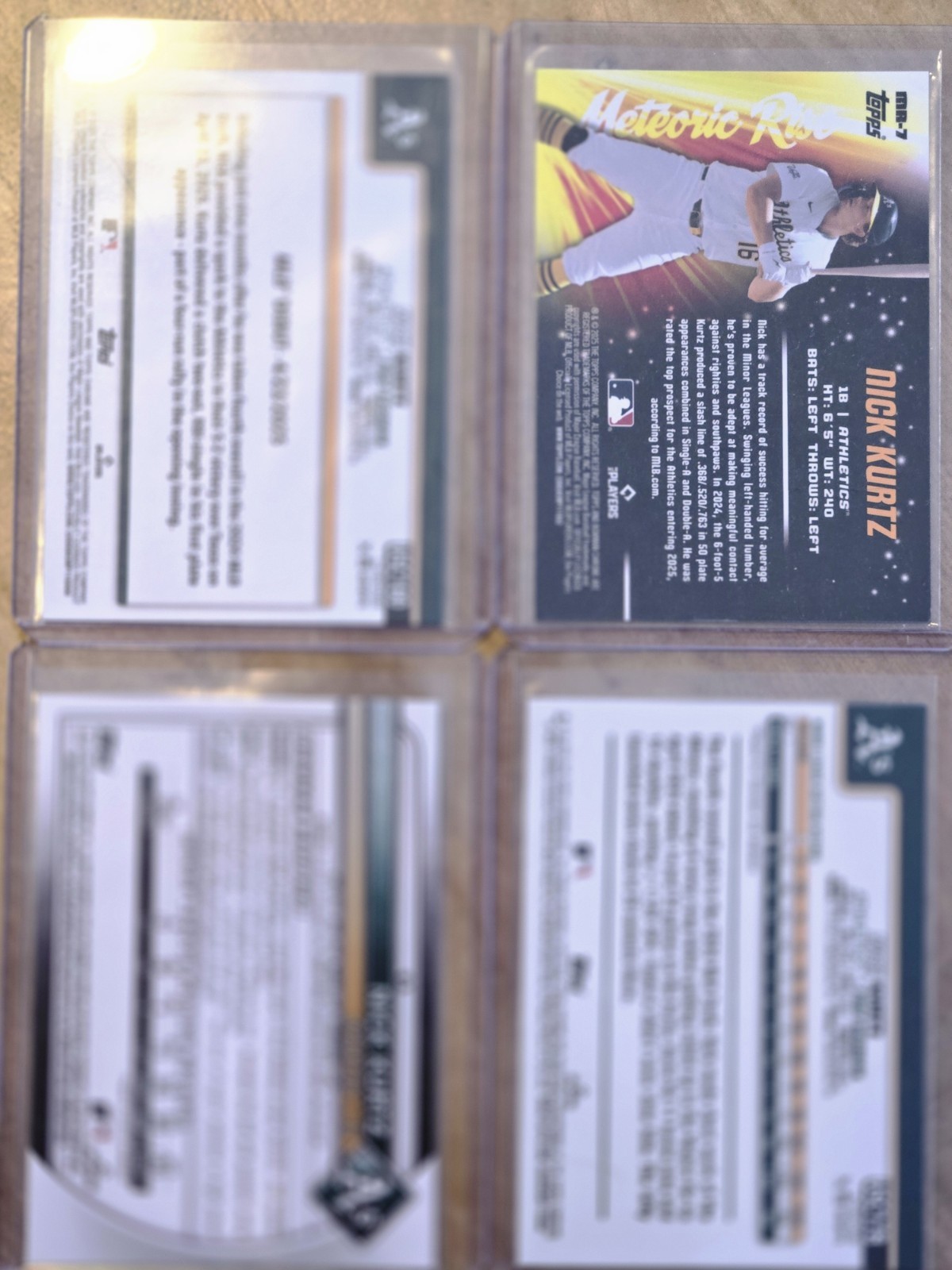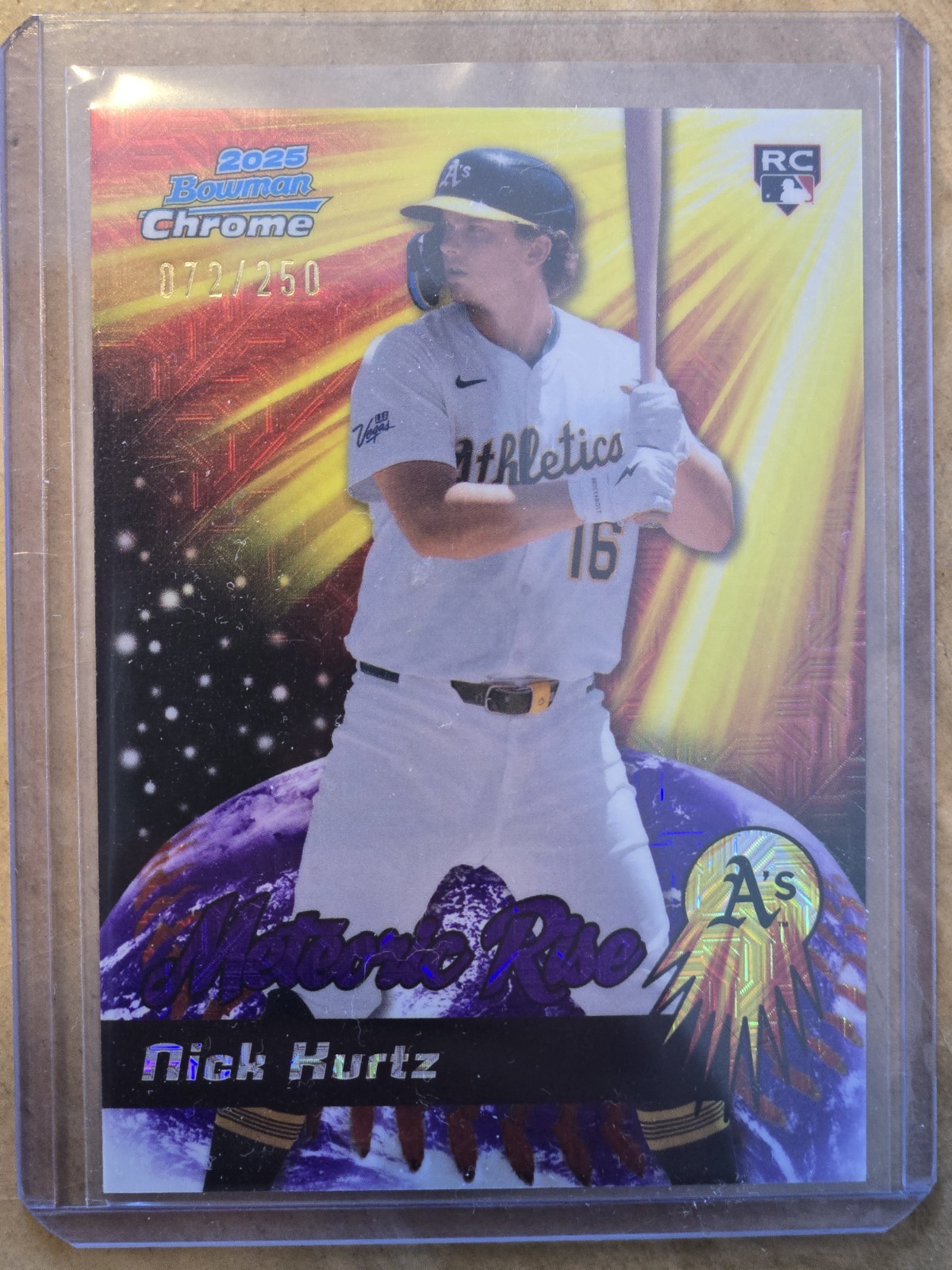 Nick Kurtz 4 card rookie lot: 2025 Bowman Chrome Meteoric Rise Purple 72/250 (MR-7) 2025 Bowman Chrome (93) 2025 Topps Chrome Update (USC178) 2025 Topps Chrome Update (USC180) Raywave
