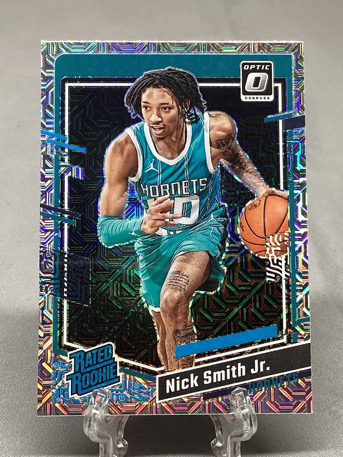 Elevate your collection with the Nick Smith Jr. Rated Rookie Mojo card from the 2023-24 Panini Donruss Optic Choice Basketball series. Card number 224 features a stunning hologram design and is a coveted piece for any basketball enthusiast or card collector. The card celebrates the potential of Nick Smith Jr. with the Los Angeles Lakers, capturing the excitement of the NBA Finals and the passion of the sport. Crafted in the United States, this limited edition card is a testament to quality and exclusivity. As part of the Mojo parallel variety, it stands out with its unique chase features and is a short print run, making it a rare find. The card is printed in English and comes in a standard size, fitting seamlessly into any display or album. Enjoy this piece of basketball history and the legacy of a rising star.