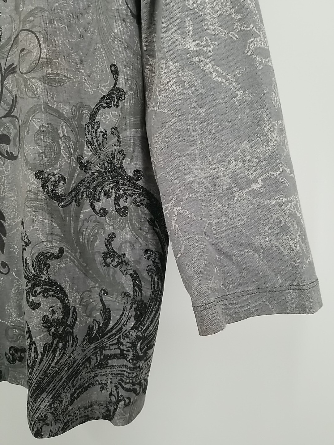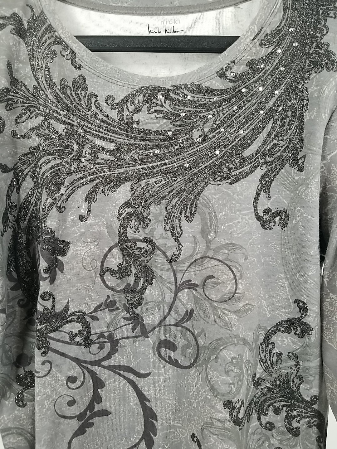 Elevate your casual ensemble with this Nicki by Nicole Miller gray knit top. Adorned with floral patterns and rhinestone accents, this regular fit t-shirt features a collarless round neck and 3/4 sleeves. Made of 100% cotton, this all-season top is perfect for any occasion. Available in size M, this basic style top is perfect for women who want to add a touch of sophistication to their wardrobe. In preowned condition,see pics for details. Measurements are approximate. Top to bottom 22 inches Pit to pit 20 inches