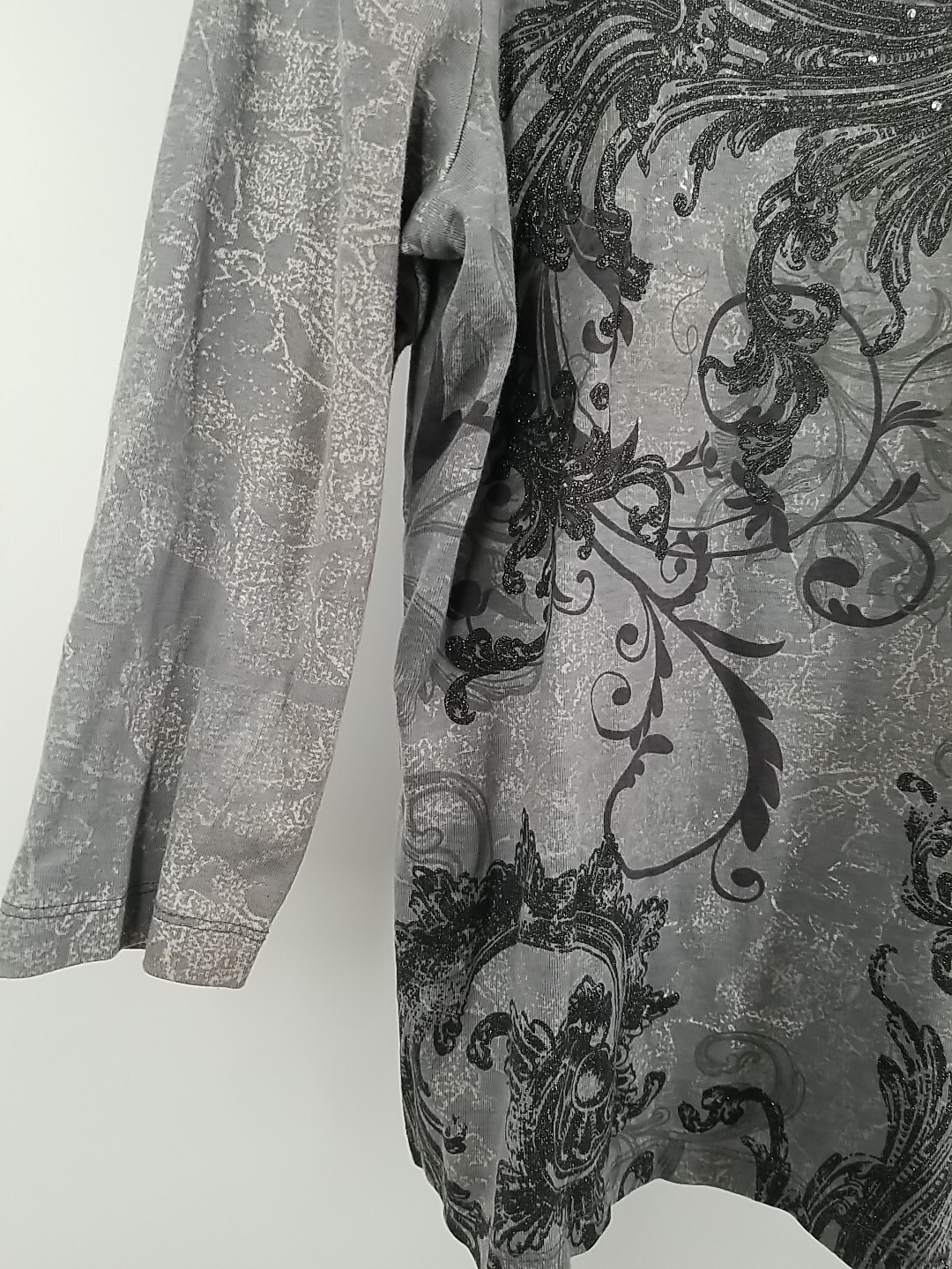 Love this top—soft cotton feels great, and the floral rhinestone details add just the right amount of sparkle. The 3/4 sleeves make it versatile for any season, and the fit is comfortable yet polished. Perfect for dressing up jeans or pairing with a skirt. The gray shade is neutral but still stands out. A stylish find!