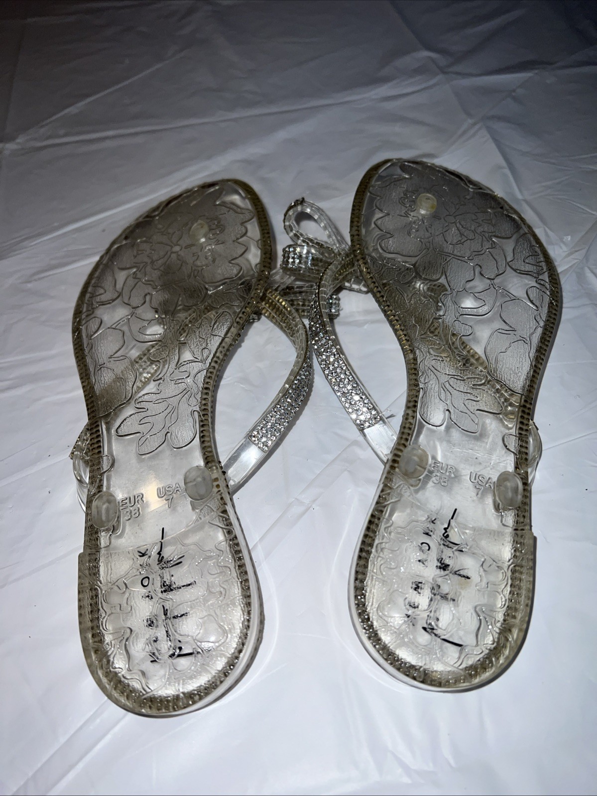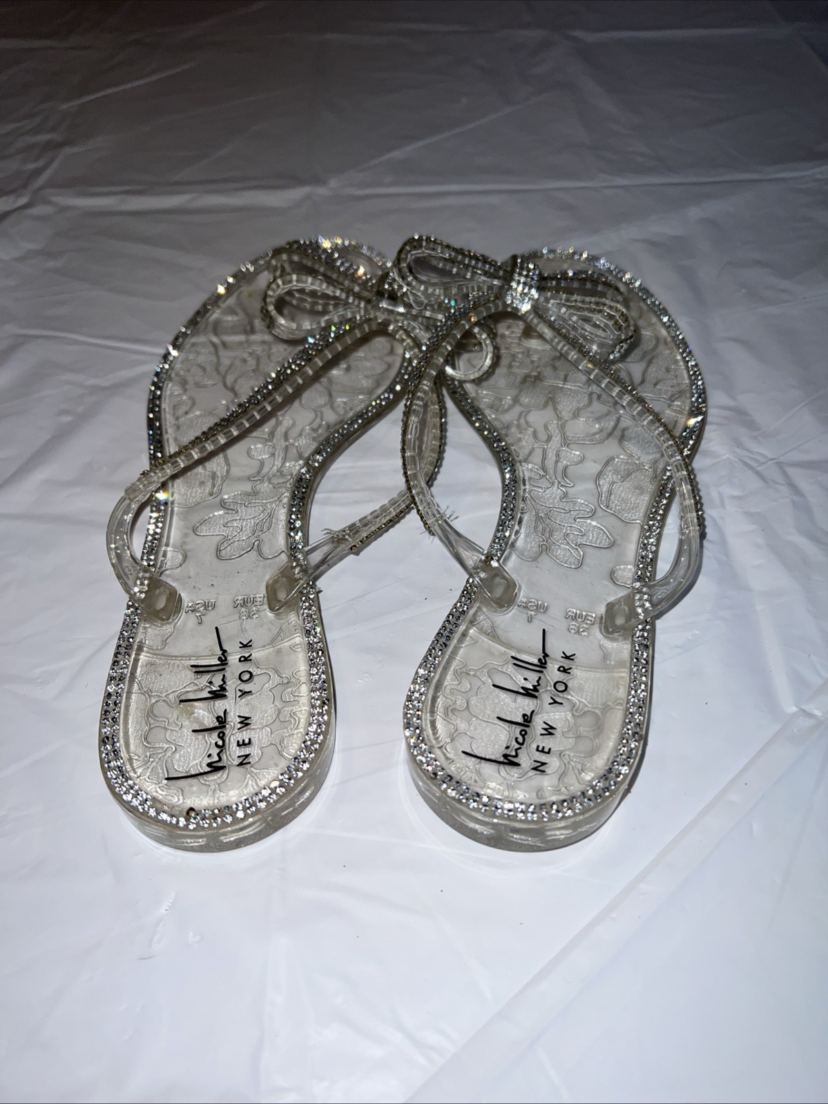 The Nicole Miller Jelly Thong Sandal in size 7 is a stylish and trendy choice for women looking for a casual and comfortable shoe for the summer and spring seasons. The slip-on slide design features a diamond bow accent, studded detailing, and rhinestones for added flair. Made with PVC upper and lining materials, this synthetic outsole sandal is perfect for adding a touch of personality to any outfit. The black and clear color scheme and narrow width make it a versatile option for everyday wear.