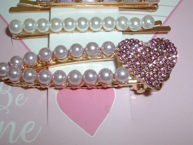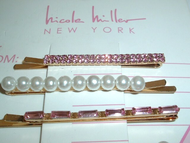A darling hair set by Nicole Miller New York with 4 golden bobby pins with white pearls and chaton cut and baguette cut, pink rhinestones and a hair clip of pink pearls and pink rhinestone heart. All new, still on original "Nicole Miller Be Mine" card. Half priced.