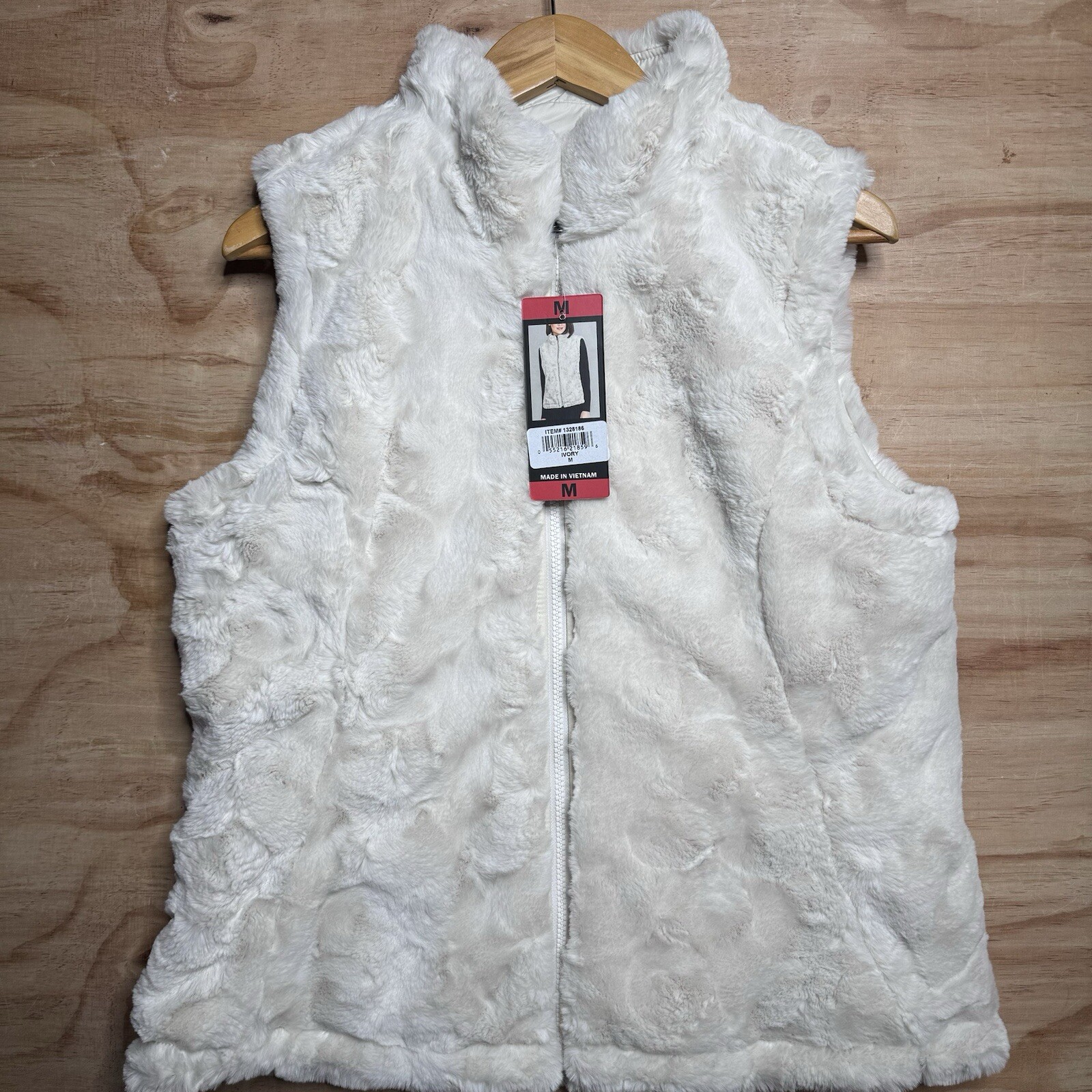 This is a Nicole Miller vest jacket in size M for women. It is ivory in color and made of faux fur with a quilted style. The jacket features a mid-length cut, zip closure, polyester lining, and pockets. It is reversible, with polyester insulation for added warmth.