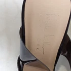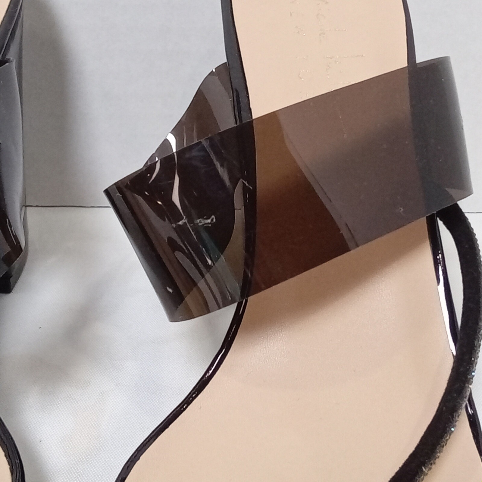 Pre-Owned, has flaws, see photos. Nicole Miller, size 7.5, black patent strappy block heel. Toe straps have jewels, ankle strap is black and transparent. Never worn, but there is a scratch on the ankle strap an some jewels are missing, hard to see though. Measurements are approximate: Shoe width - 5-5.5" (measured at the widest part of the shoe on top of foot) Heel height - 4" Heel type - Block UK = 3.0, EUR = 35.0, CM = 5 Stored in a smoke-free and pet friendly environment. All orders ship within two business days, combine orders for discount on shipping. Reasonable offers accepted. Thanks for looking!