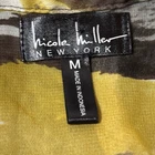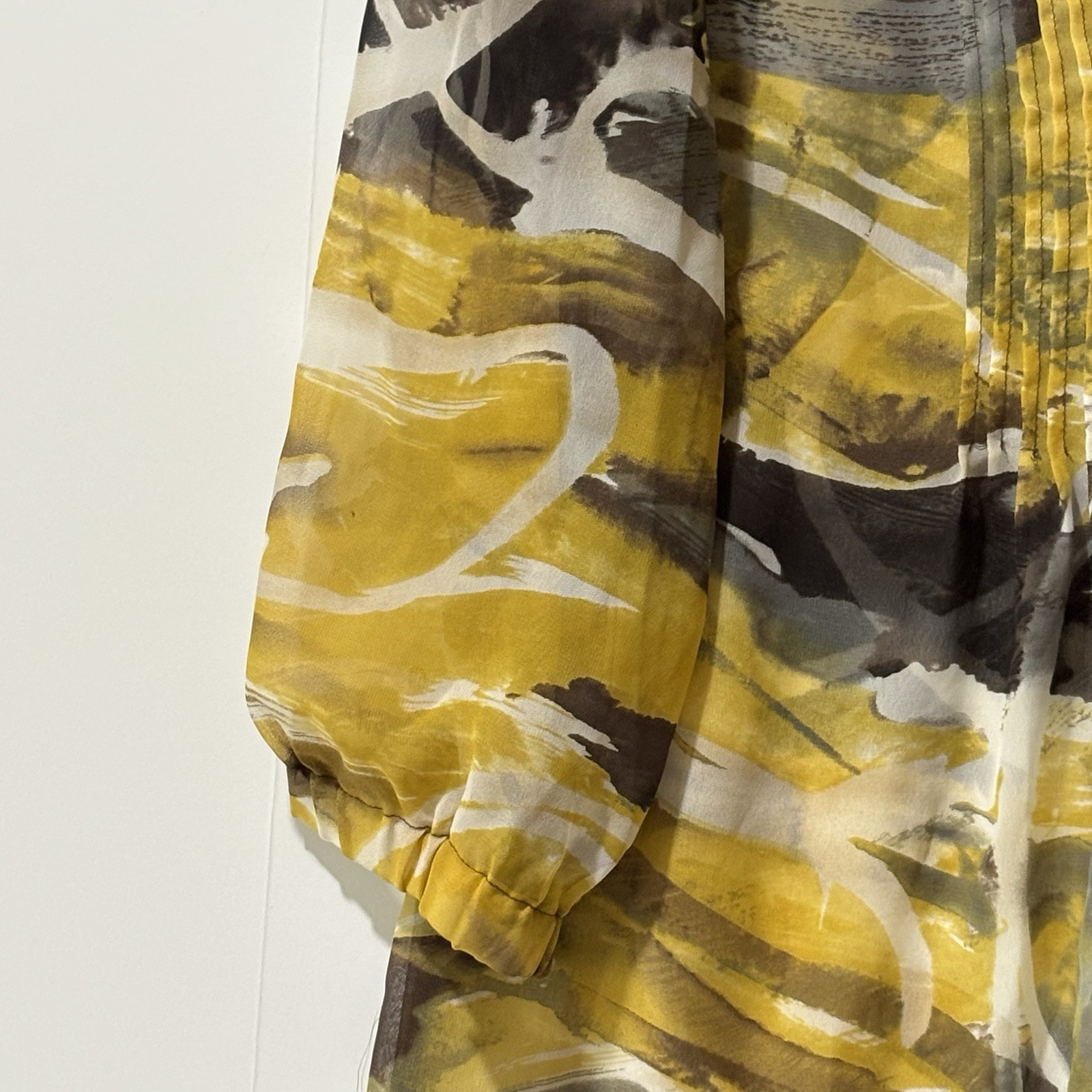 Elevate your wardrobe with the Nicole Miller Women's Medium Abstract Earthy Puff Sleeves Sheer V-neck Tunic Blouse. The blouse boasts an eye-catching multicolored abstract pattern, with pleated accents that add a touch of texture and sophistication. Its lightweight and breathable chiffon fabric, composed of 100% polyester, ensures comfort and ease of movement, making it perfect for a variety of occasions from casual outings to cocktail parties. The relaxed fit tunic style of this blouse offers an oversized feel with long puff sleeves that provide a playful yet elegant silhouette. Ideal for transitioning through seasons from summer to fall and into spring, this garment is machine washable for easy care. The collarless, sheer V-neck design adds a minimalist, naturals theme to your ensemble, making it a versatile and stylish addition to your collection.