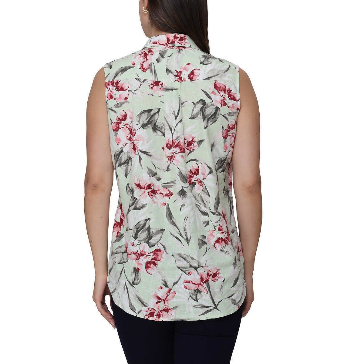 Nicole Miller Women's Linen Blend Sleeveless Top Size: Large Color: Green Content: 57% Linen 41% Viscose 2% Spandex Care Instructions: Machine wash cold with like colors Delicate cycle. Wash inside out. Do not bleach. Dry flat. Iron at low setting. Do not dry clean.