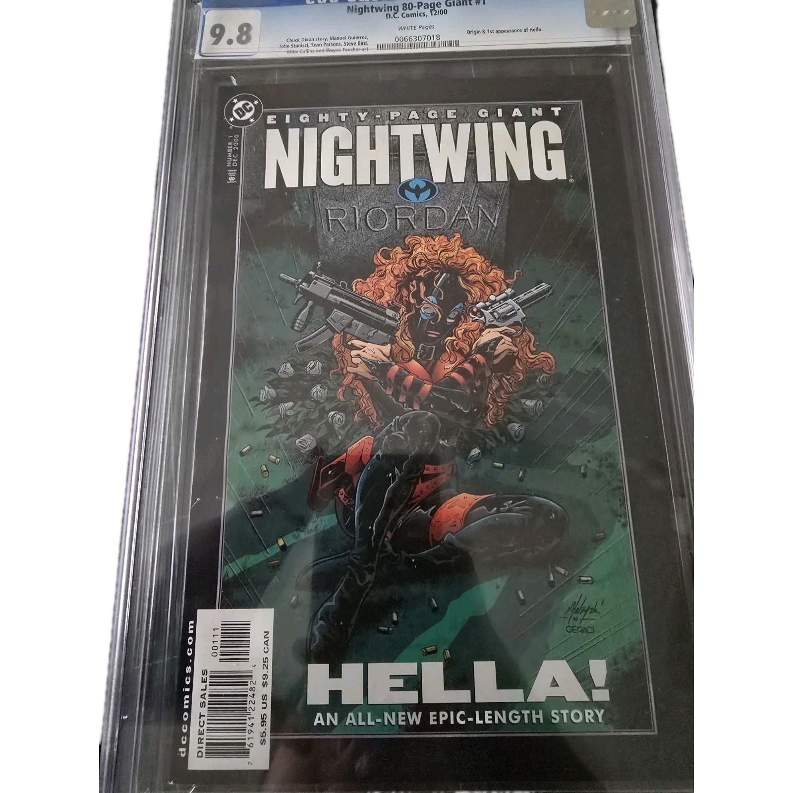 Nightwing #1 (2000, DC Comics) – CGC 9.8 | Key Issue | 80-Page Giant Graded: CGC 9.8 (Near Mint/Mint) Publisher: DC Comics Release Year: 2000 Story Title: “The Lepers” Key Issue Details: Story Overview: Nightwing #1 (2000) features the story “The Lepers,” exploring Dick Grayson’s dual life as Blüdhaven’s protector and Gotham’s prodigal son. This 80-page giant dives into his moral code, his ties to Batman, and the rise of a deadly new villain — Hella, appearing for the first time in DC continuity. Condition: Professionally graded CGC 9.8 – White Pages Case is clean, clear, and well-preserved Stored in a smoke-free, climate-controlled environment Why Collect: This issue is a must-have for fans of Nightwing, Batman Family, and 2000s DC key issues. With the first appearance of Hella and a strong origin focus, it’s a modern key that continues to gain interest among collectors. Shipping: Securely packed with bubble wrap and box protection International shipping available through eBay Global