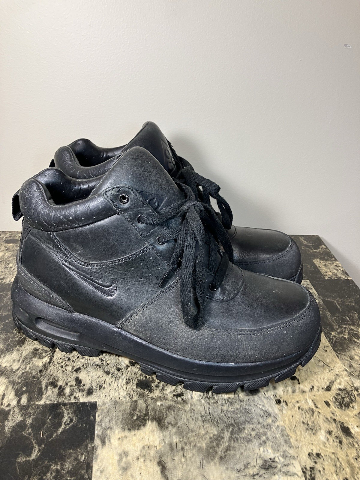The Nike ACG Men's Air Max Goaterra Boot in black is a stylish and functional hiking boot designed for outdoor adventures. With a lace-up closure and standard shoe width, this boot offers a secure and comfortable fit. Made with leather upper and insole materials, it provides durability and breathability, making it ideal for long hikes. The lightweight design and leather outsole material ensure a comfortable and stable experience on various terrains. Perfect for the active man who values both style and performance in his footwear.